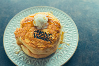 カフェでは東京・麻布台の系列店、Balcony by 6th で人気No.1のオリジナルパンケーキがふわふわでしっとり、口の中で溶けるような食感。