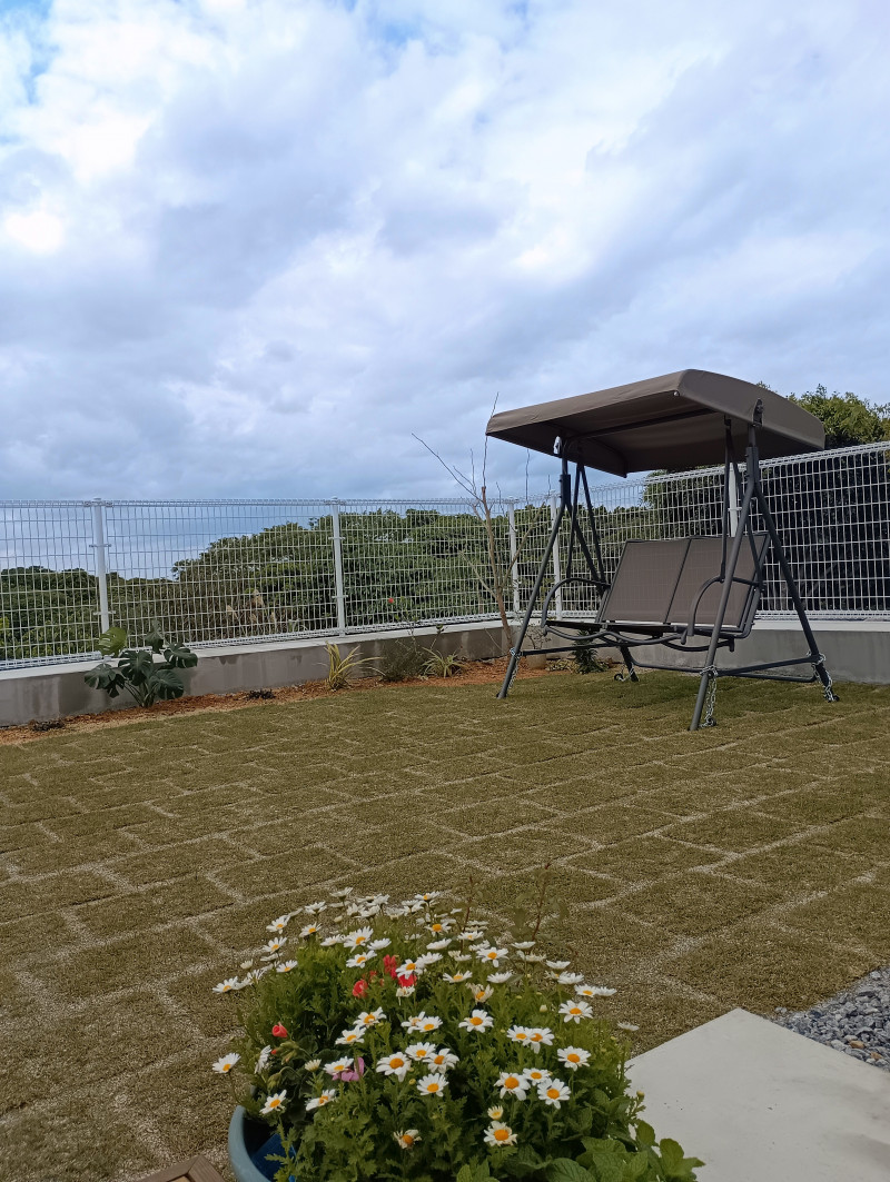 山々の景色に囲まれた芝生のガーデンではのびのびと遊んだり、ブランコでゆったり休憩できます。