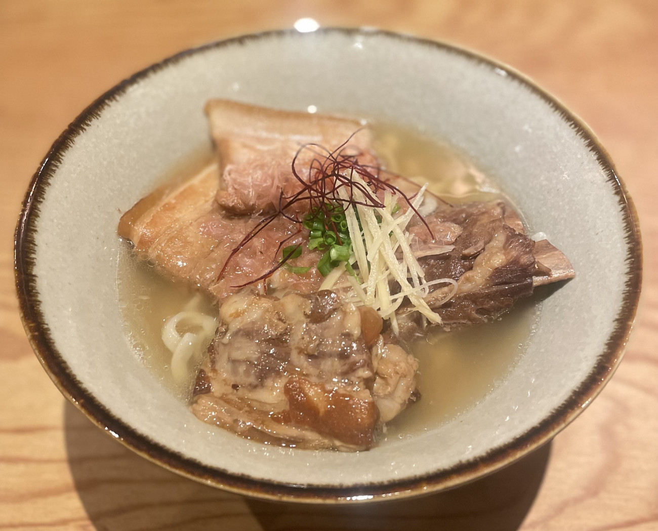 旨味と上品な香り。削りたての鰹節が出汁に溶け込み、ひと口ごとに深まる、格別の余韻を生み出します。国産の本ソーキは骨周りにあたるスペアリブ。赤身と脂のバランスがよく、骨から出る旨味が豊かです。国産の軟骨ソーキはじっくりと煮込むことで軟骨まで柔らかく、とろとろプルプルの食感です。三枚肉は皮付きで、醤油ベースのタレで柔らかくなるまで煮込んでいます。
