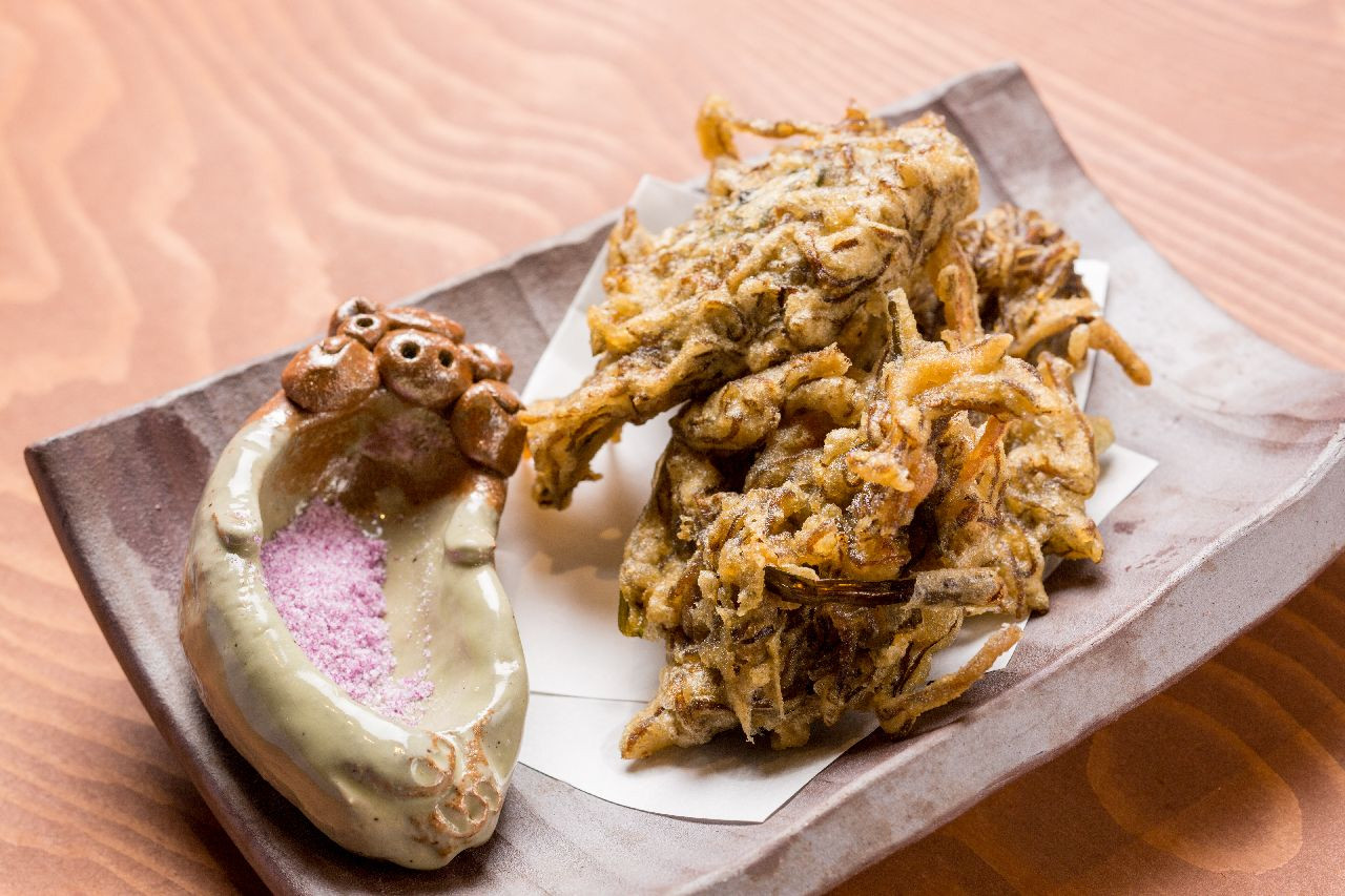 新鮮もずくの天ぷらは外カリ中モチ。自家製出汁塩で味わう絶品。