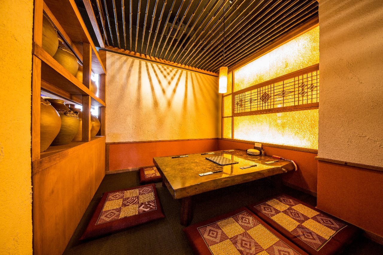 和紙と竹の隙間から柔らかな光が差す癒し空間。お子様連れや接待にも人気。