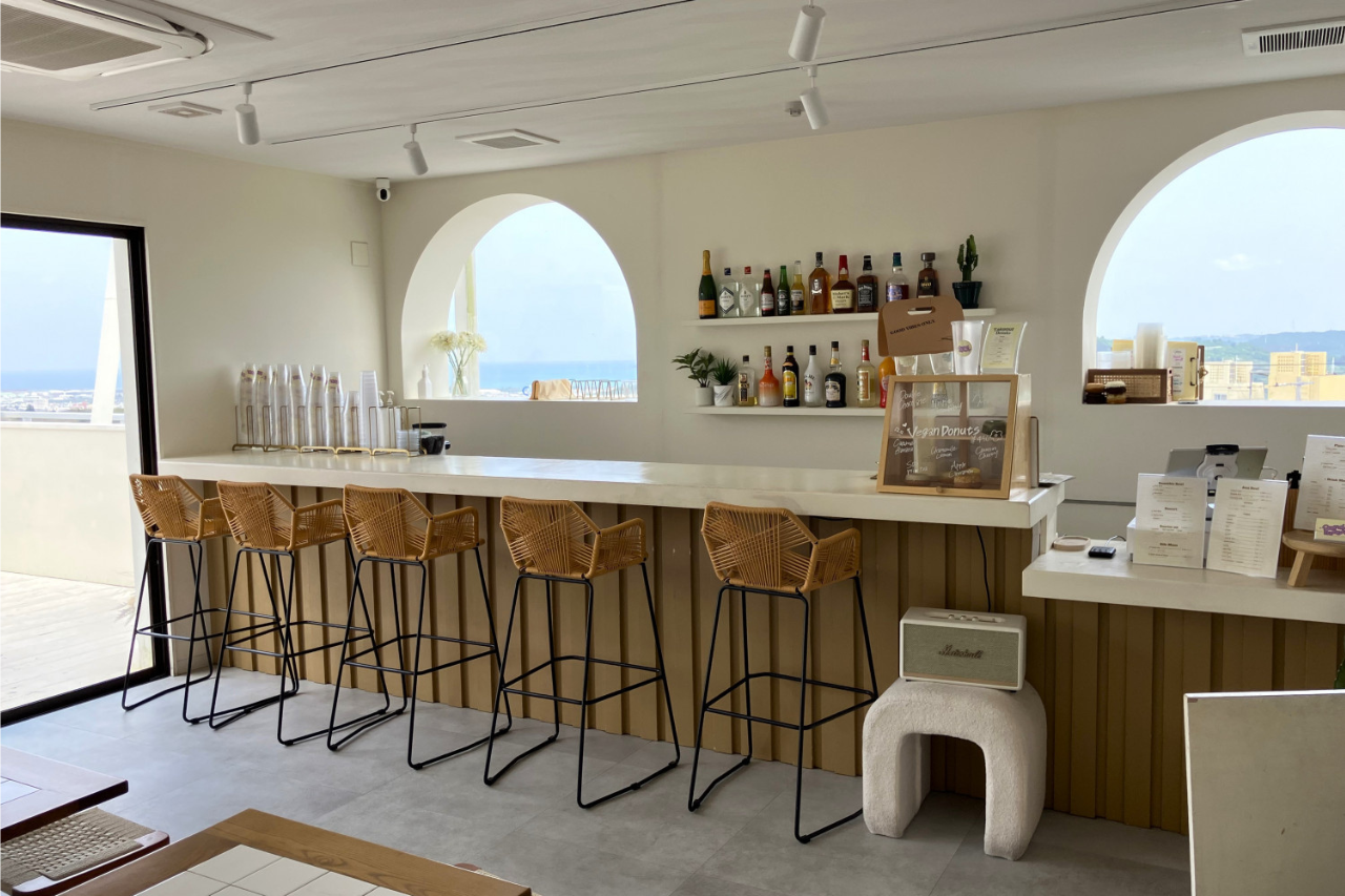 ビル4階の店内にはテーブル席と、海を一望できるテラス席をご用意。テラスではペットの同伴もOKです。晴れた日には、美しい景色を眺めながら、贅沢なカフェタイムをお楽しみいただけます。