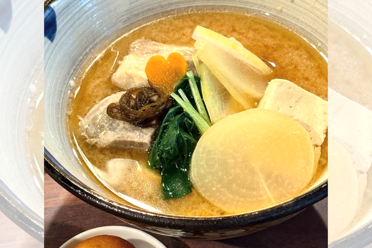 看板メニューの「味噌汁定食」には、琉球王朝時代から続く老舗「玉那覇味噌醤油」の“王朝みそ”を使用。軟骨ソーキ、豆腐、冬瓜、にんじん、昆布巻きなど、季節によって変わる具だくさんのみそ汁は、やさしい香りと深いコクが自慢です。