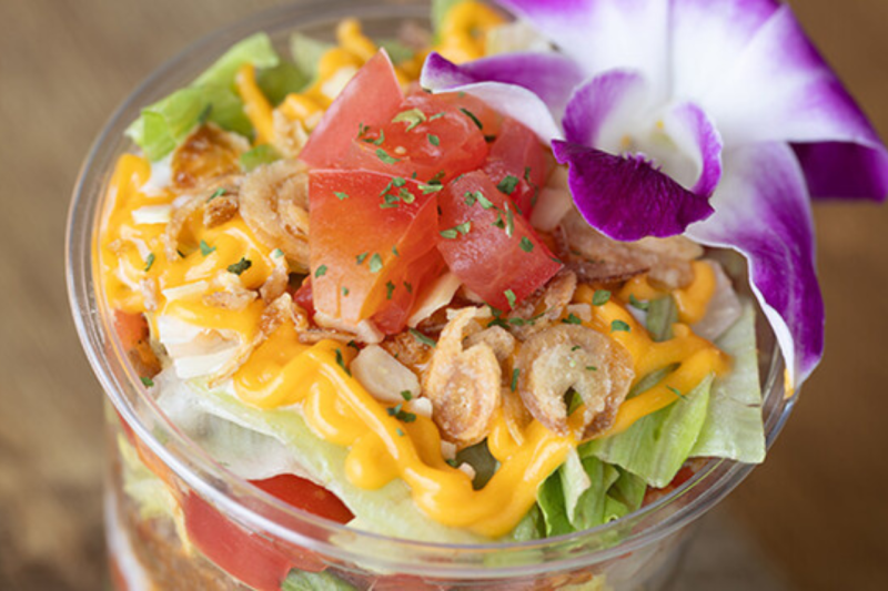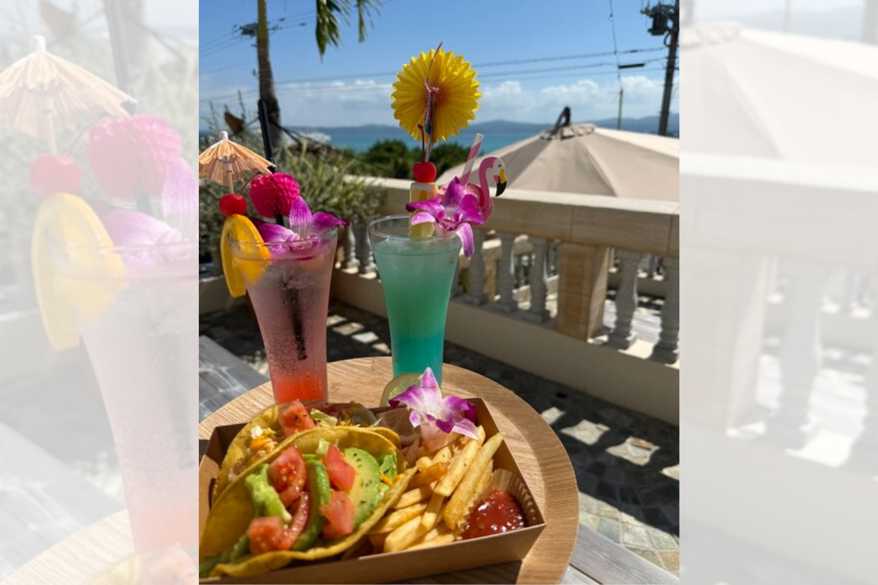 人気メニューは、彩り豊かに重ねた「ミルフィーユ古宇利タコライス」。見た目の華やかさと満足感のある味わいが魅力です。ほかにも「スパムポテトフライ」や、沖縄素材を使った「ジェラート」など、気軽に楽しめるカフェメニューをご用意しております。