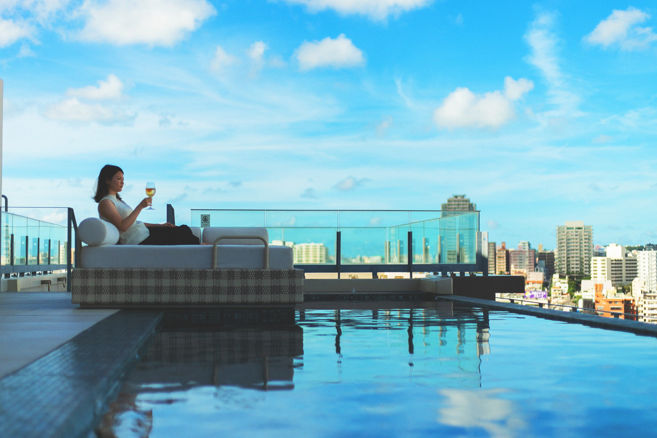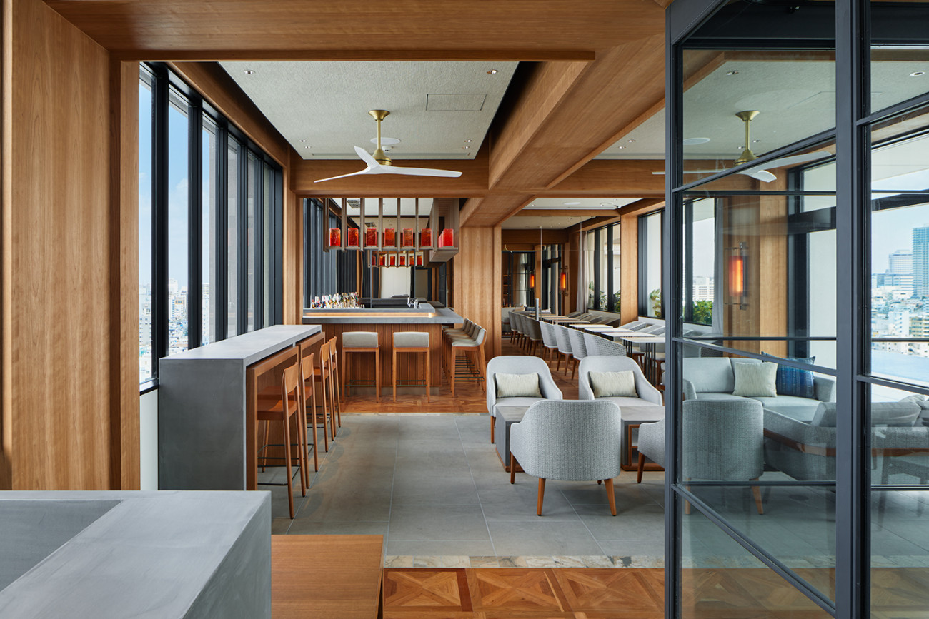 ホテル最上階に広がる、那覇市内でも希少なルーフトップバー。木を基調とした落ち着きのある空間で、那覇のまちを一望する開放的な屋外テラスには水盤を設け、リゾートの高揚感を高めます。