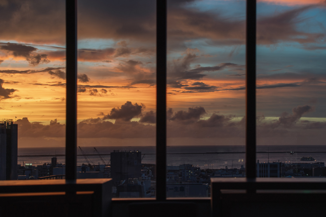 海に沈むロマンティックなサンセットと共に食前酒を堪能し、美しい薄明から夜景にかけた変わりゆく那覇の情景をお楽しみください。