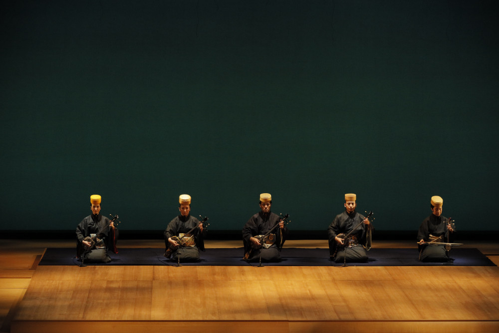 「北宮十二頌曲(ほっきゅうじゅうにしょうきょく)」は、歌三線四名と胡弓一名による琉球古典音楽の奏楽で、冊封宴だけの特別な琉歌(歌詞)で歌いあげられました。撮影:仲程 長治 氏