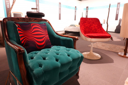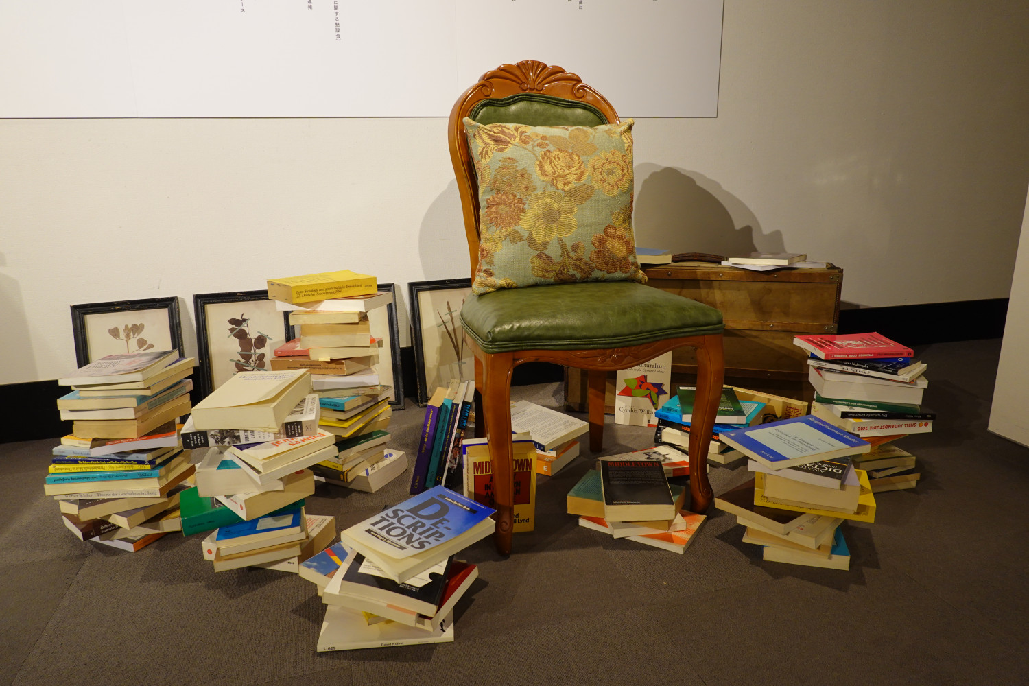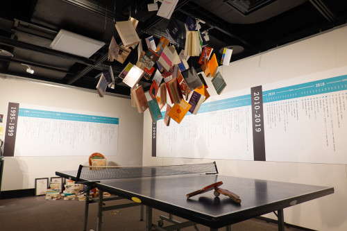入口のエリアでは、沖縄芸能年表をベースに、関連するアイテムで表現するインスタレーションが。