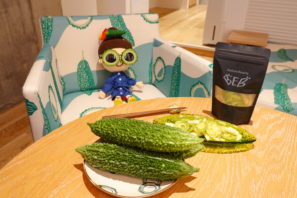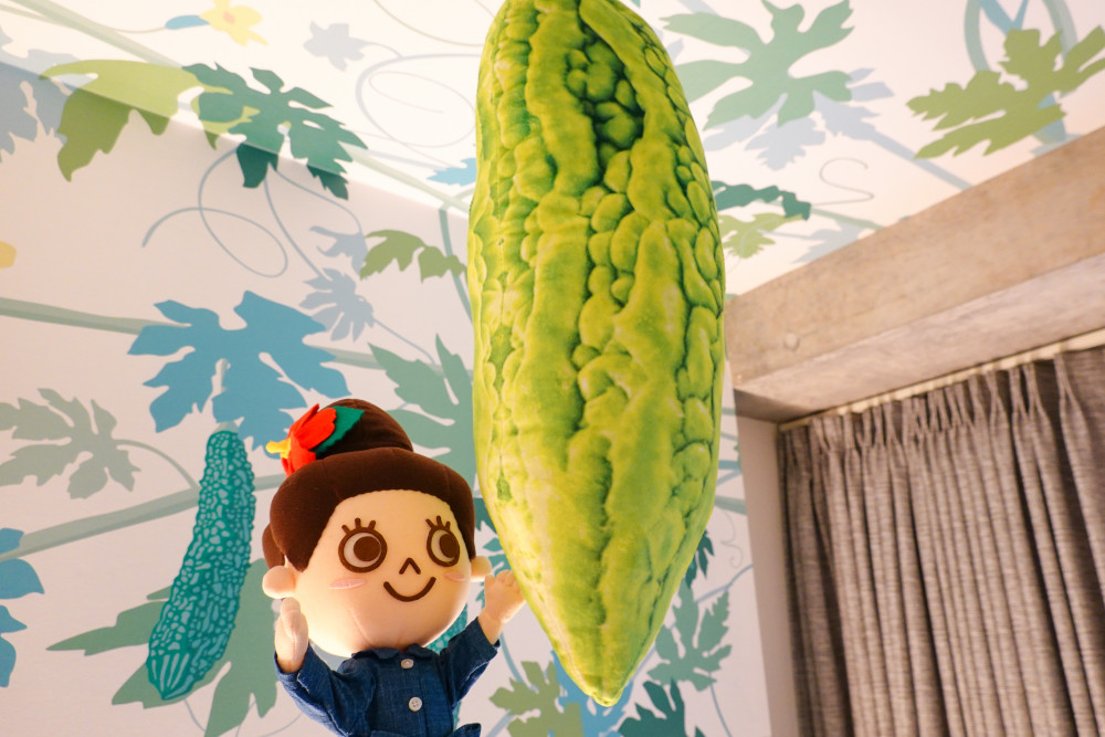ゴーヤルームはお部屋全体がゴーヤ色に装飾されていて、ゴーヤとスパムとタマゴのクッションはゴーヤチャンプルーをイメージしているみたいですよ(^^♪