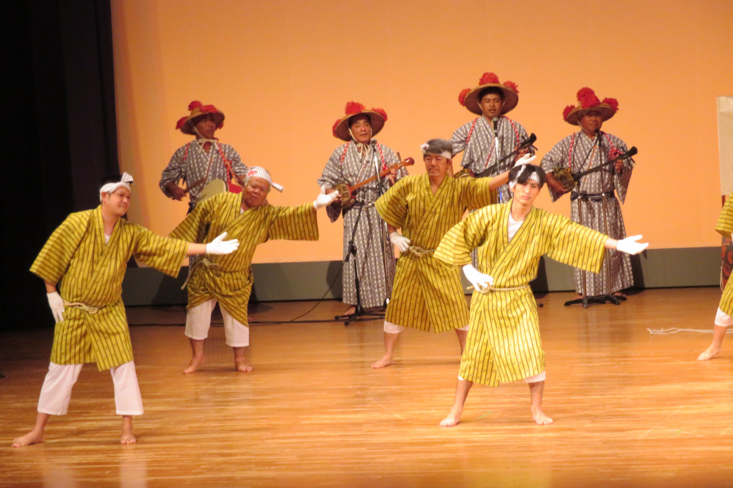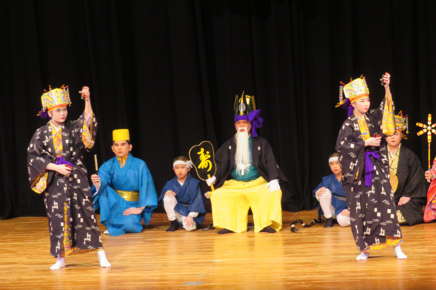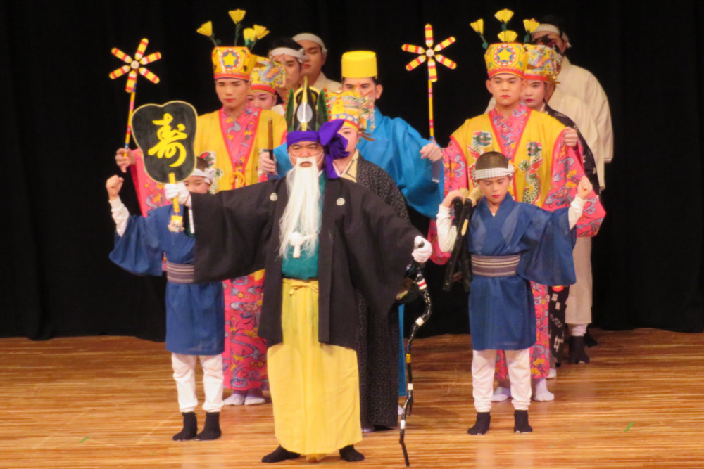 続いて、交流実演として沖縄本島中部の「金武町並里地区伝統芸能保存会」の皆さんによる、金武(きん)町の棒かじゃで風・なぎなた・高平良万歳が披露されました。