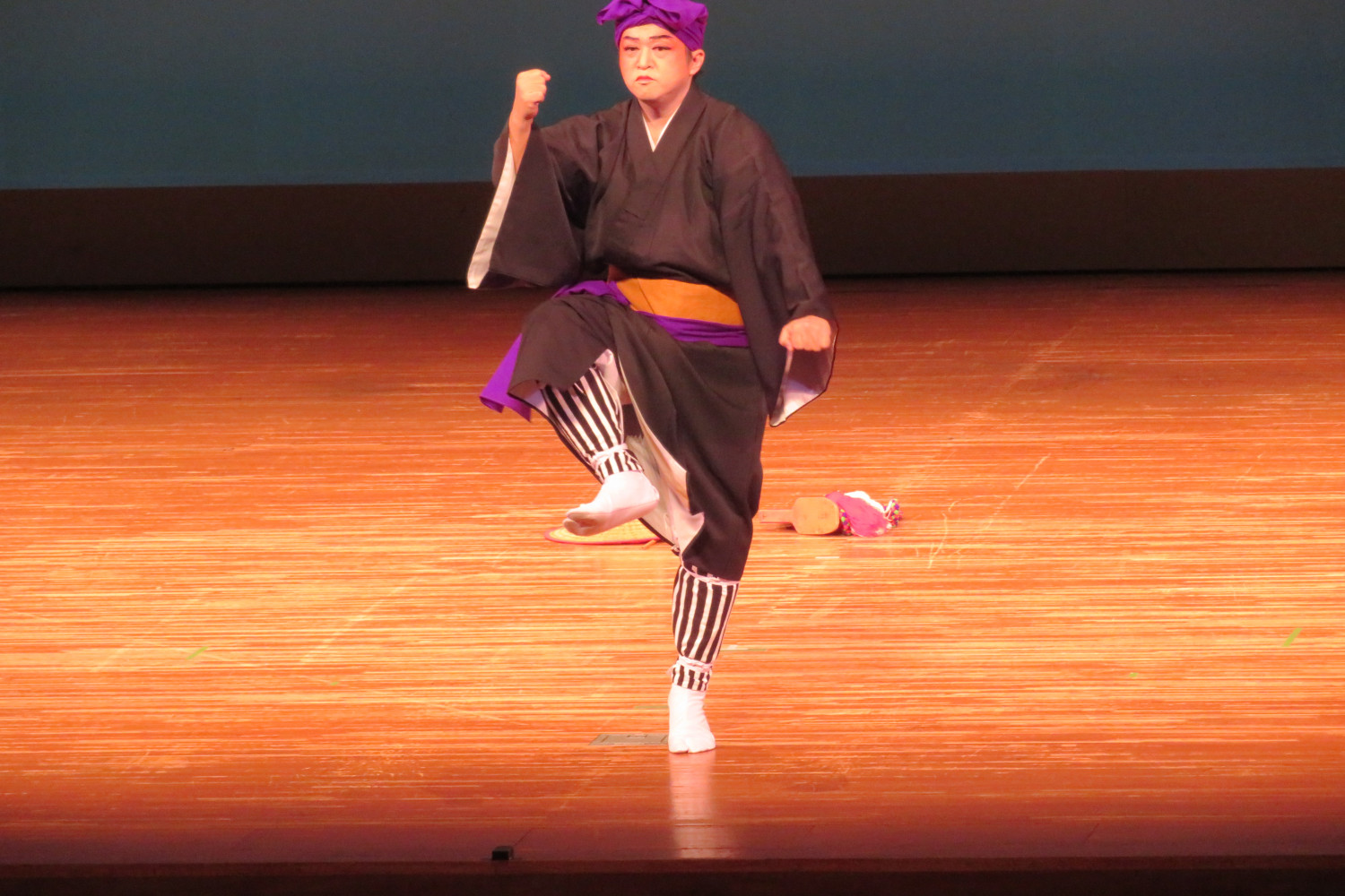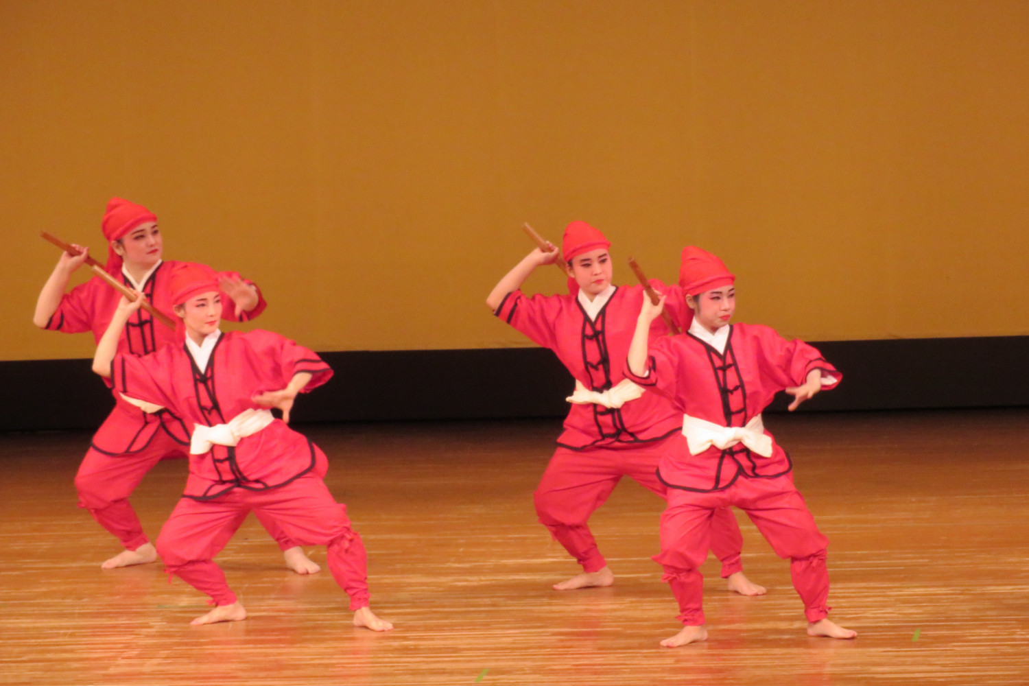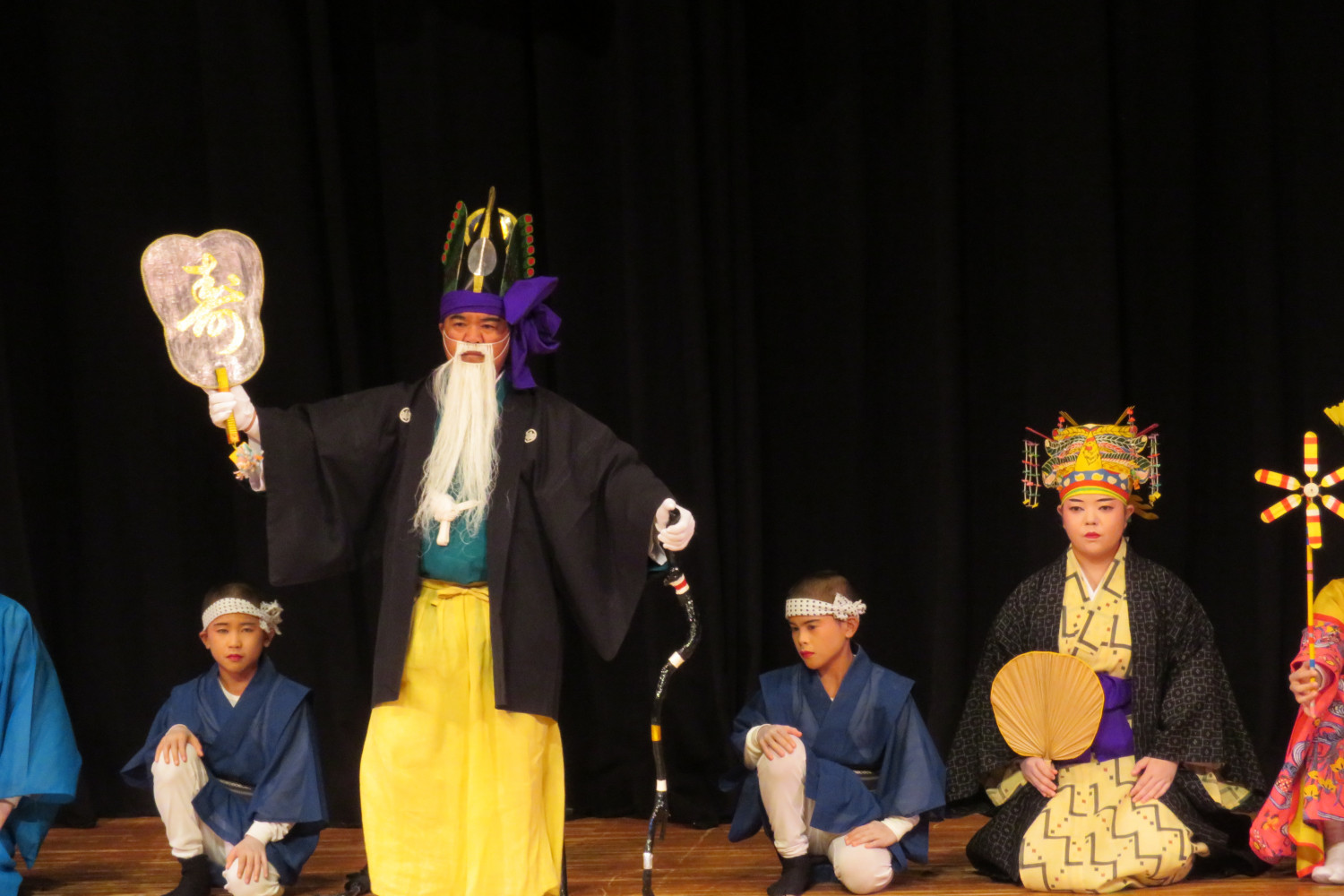 続いて、交流実演として沖縄本島中部の「金武町並里地区伝統芸能保存会」の皆さんによる、金武(きん)町の棒かじゃで風・なぎなた・高平良万歳が披露されました。