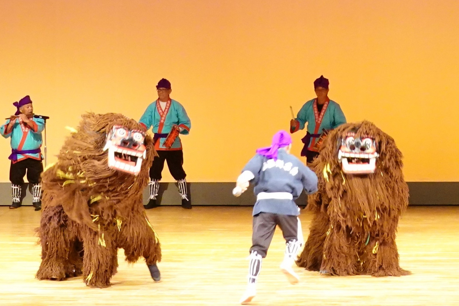 次に、2頭の獅子が眠りから目を醒まし、地域の発展と無病息災を祈願する「比嘉の獅子舞」!市指定の無形民俗文化財です。