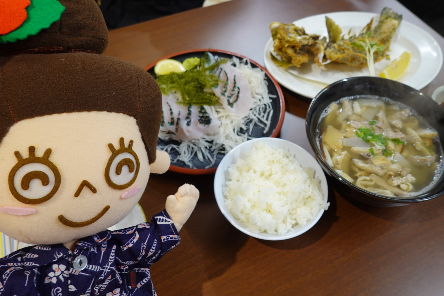 「持ち上げ」とは、1階で購入した肉や鮮魚を、2階で調理してもらい食べることができる仕組みのことです。旧第一牧志公設市場からの名物システムがちゃんと継承されていましたよ。マハエも久しぶりの「持ち上げ」体験♪1階の「翁長鮮魚」さんでイラブチャーを購入し、2階の「あだん」さんで調理してもらいましたよ!イラブチャーは半身をお刺身に、もう半身は唐揚げにしてもらって1匹で2つの調理法で味わってみました。美味しい&楽しいー!