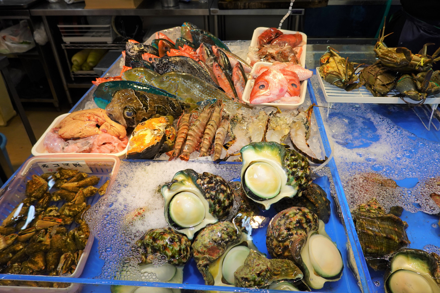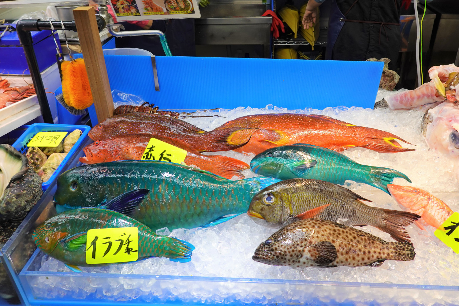 1階の鮮魚部門に来ました!見るだけでも楽しい、カラフルな沖縄の魚や貝の数々! 熱帯魚みたいで本当に食べられるの?と思う人もいるかもしれませんが・・・実際、食べてみると、その味は絶品です!ここには沖縄全島より水揚げされた新鮮は魚や貝が豊富に取り揃えられています!