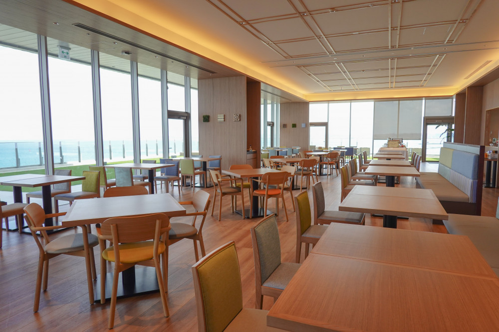 ロビーから奥へ進むと海を見渡せる開放感あふれるCafe&Dining ACOUSA(アコウサ)があり、カフェラウンジエリアとレストランエリアが広がっています。