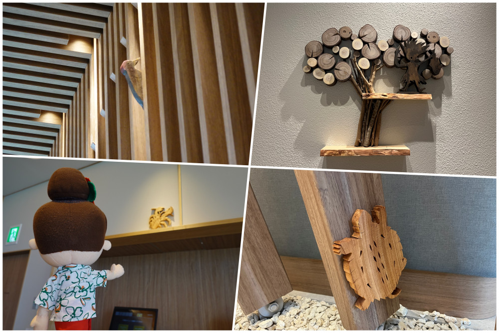 ラウンジに設置された沖縄の代表的な建築材として使われる「赤木」のテーブルの上には、流木と可愛いヤンバルクイナのオブジェが飾られていました(^-^)