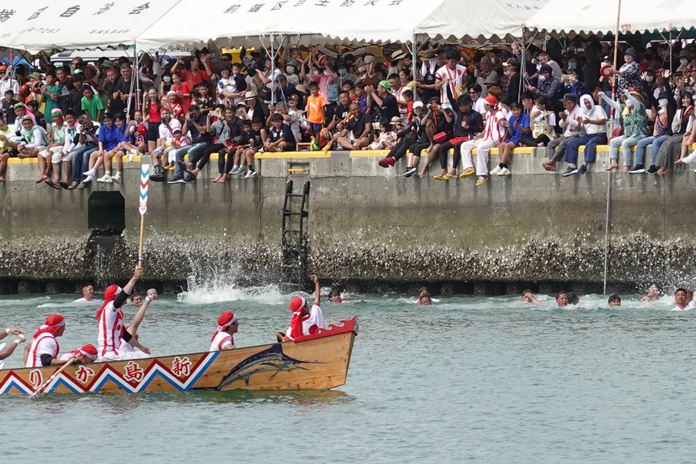 クンヌカセーは通常のスタートでレースが始まりますが、途中で船を転覆させ、漕ぎ手の方々が一斉に海の中へ!