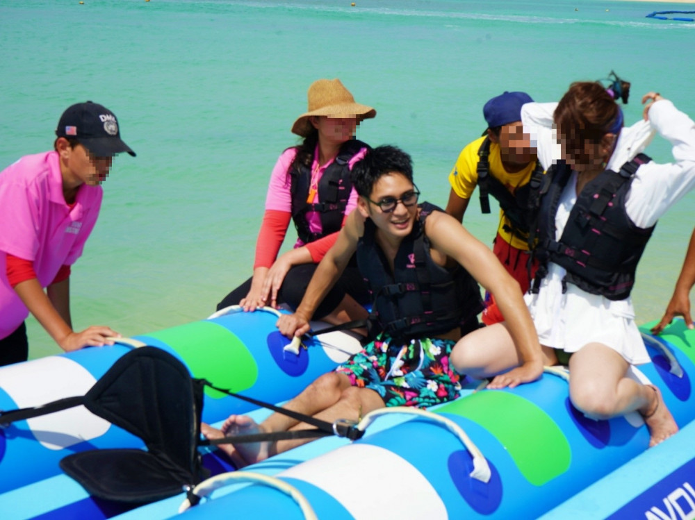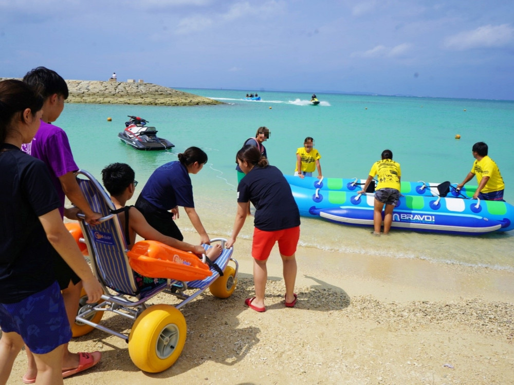 沖縄のマリンアクティビティの代名詞と言っても過言ではない”バナナボート”もこちらのビーチで楽しめます!バナナボートまでの移動も”モビチェア”があるので楽々移動出来ちゃいますよ♪