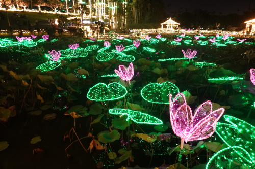 ”沖縄南国イルミネーション”は、約400万球もの電飾で蓮の花やハイビスカスなどの花々をモチーフにしたイルミネーションなど、植物園ならではのイルミネーションを楽しむことができます。2023年11月には、インターナショナルイルミネーションアワード イルミネーションイベント部門で全国2位を受賞しているんです♪また、園内の様々なイルミネーションはスタッフによる手作りと設置で行われています!