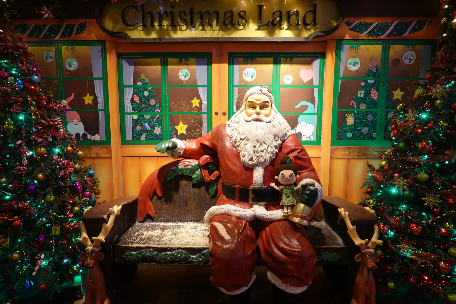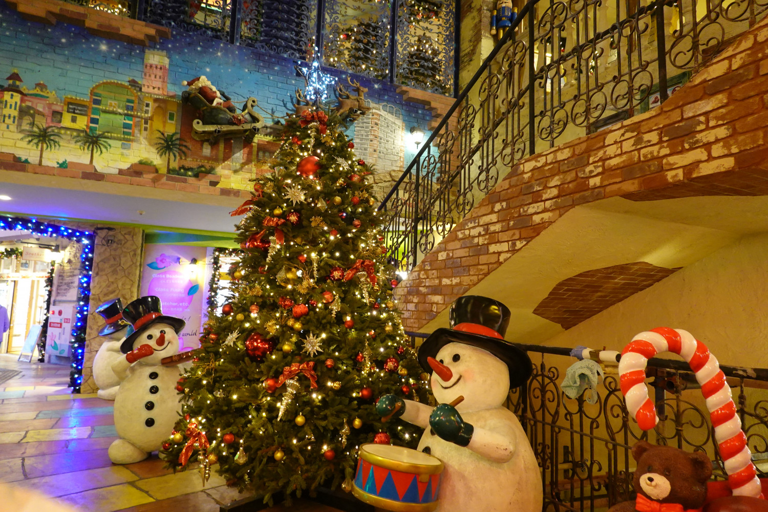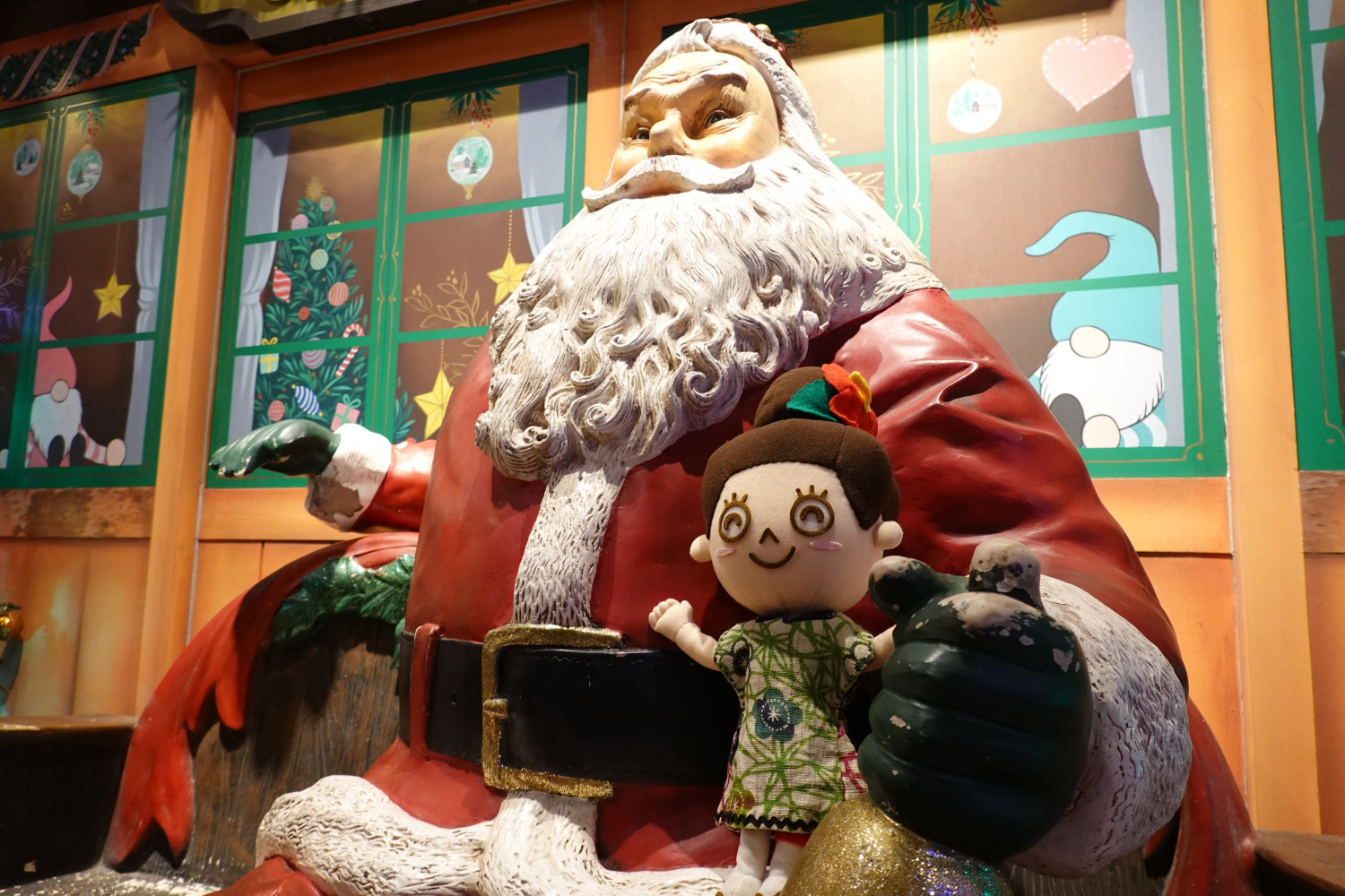 巨大なクリスマスツリーや楽器を演奏している雪だるまもいて、壁にはクリスマスの絵が描かれていましたよ♪クリスマスツリーの向かい側にはサンタさんもいたので一緒に記念撮影しました!サンタさんが大きくてマハエはいつもより小さくなった気分です(^^♪