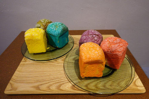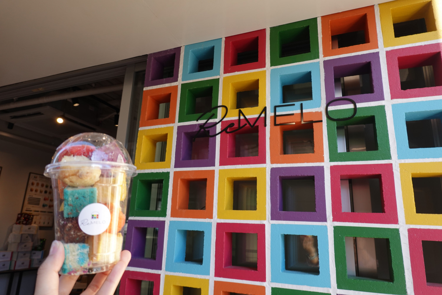 散策していると、甘い匂いが漂ってきたのでそのお店に入ってみました!店舗名は「Re:MELO (リメロ)」でカラフルでキューブ型をしたスイーツのようなメロンパンが販売されていました♪沖縄発北谷(ちゃたん)メロンパンのカラフルな色味は自然の着色を使用しているそうです!ハイビスカス味やバタフライピー味など種類豊富なフレーバーの他に期間限定の商品もありました♪1口サイズにカットされた様々な味のメロンパンが詰め合わせされた「よくばリメロ」は食べ歩きにぴったりでしたよ(≧▽≦)