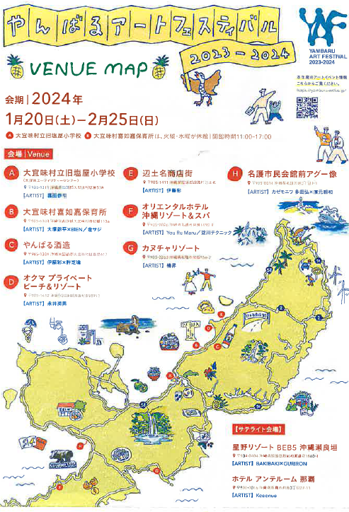 今回の「やんばるアートフェスティバル」は、下記の8つの会場と2つのサテライト会場にまたがって行われました!