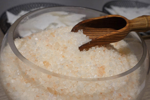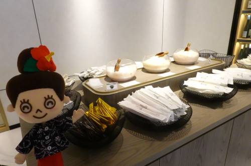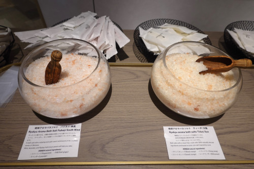 【アメニティバー】歯ブラシ・レザー・ヘアブラシ・ボディタオル・バスソルト・スキンケア3種・コーヒー・お茶。3種類のバスソルトはうれしいですね♪