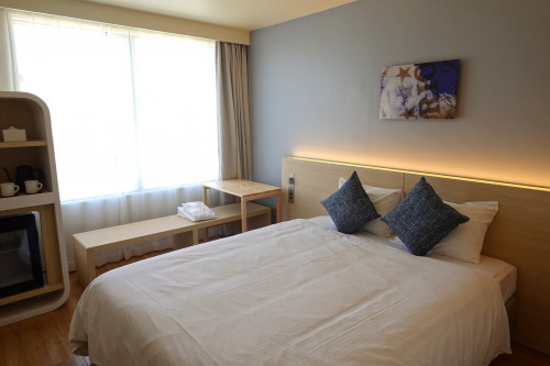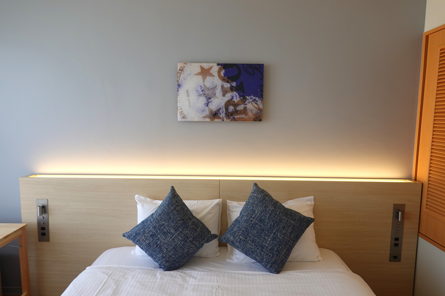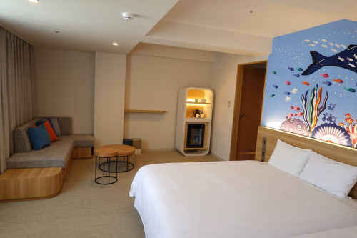 今のオリオンと、その背景にある沖縄を感じるダブルルーム。客室アートは、現在のオリオンのイメージと沖縄の風景をお楽しみいただけます。宿泊者特典として、全室お部屋の冷蔵庫にミネラルウォーター、オリオンビール、チューハイのサービスがお一人様につき各1本ずつ用意されています。