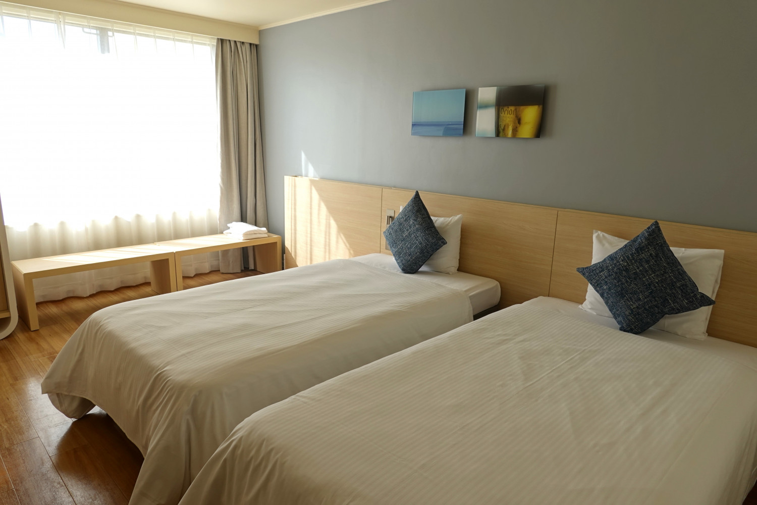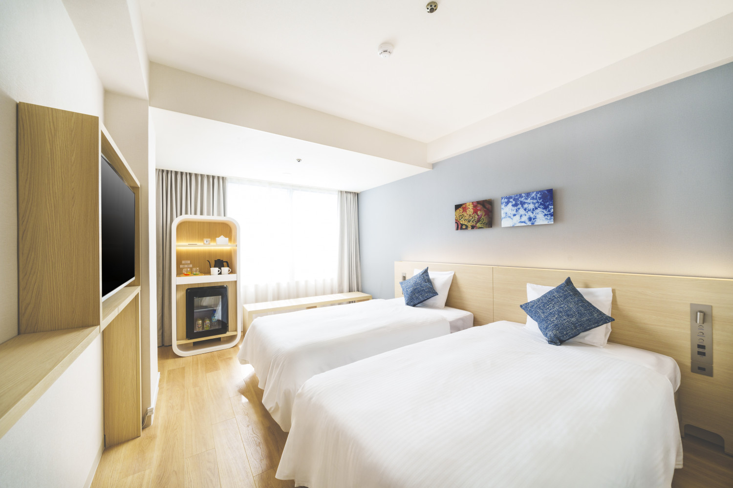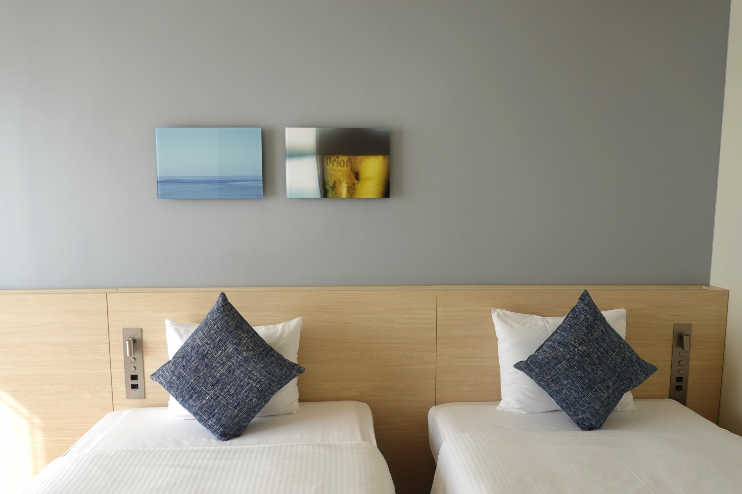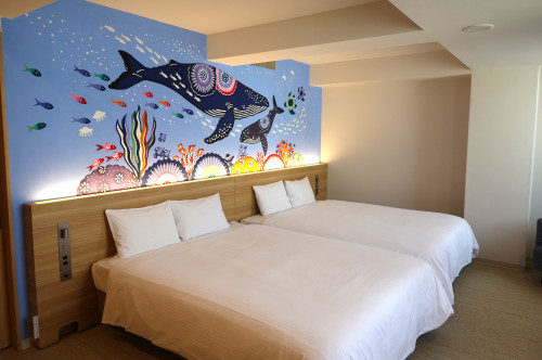 今のオリオンと、その背景にある沖縄を感じるツインタイプの客室。客室アートは、現在のオリオンのイメージと沖縄の風景をお楽しみいただけます。宿泊者特典として、全室お部屋の冷蔵庫にミネラルウォーター、オリオンビール、チューハイ のサービスがお一人様につき各1本ずつ用意されています。