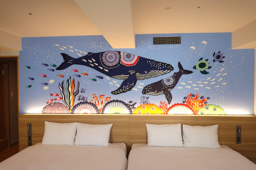 ザトウクジラの親子と海の仲間達が泳ぐ壁面アートの「海のお部屋」とヤンバルクイナやあかしょうびんなど森の仲間達が楽しく遊ぶ「森のお部屋」2種類の可愛いファミリールームです。1室4名様までご利用可能です。
