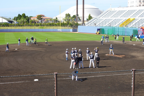 まず初めに訪れたのは、今年球団創設20周年を迎える「東北楽天ゴールデンイーグルス」のキャンプ地です!金武町にある球場「金武町ベースボールスタジアム」で選手の皆さんが練習を行っていますよ♪