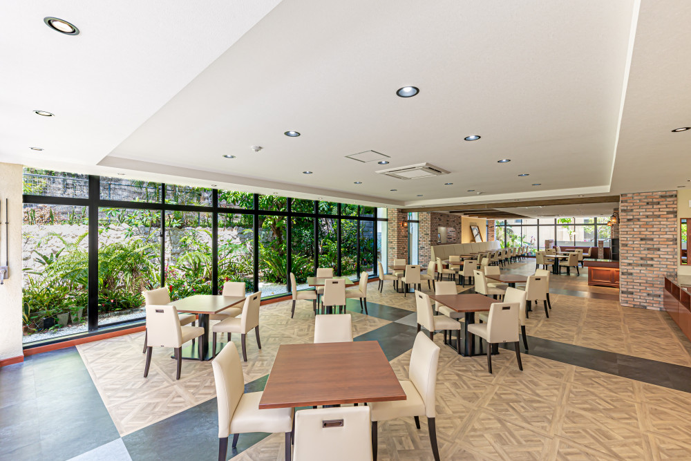 レストランから見える大きな窓からは、自然を感じられる庭園を眺めることができます。奥にある白色の石壁は、2019年に火災のあった首里城で焼け残った石材が使われているそうです!
