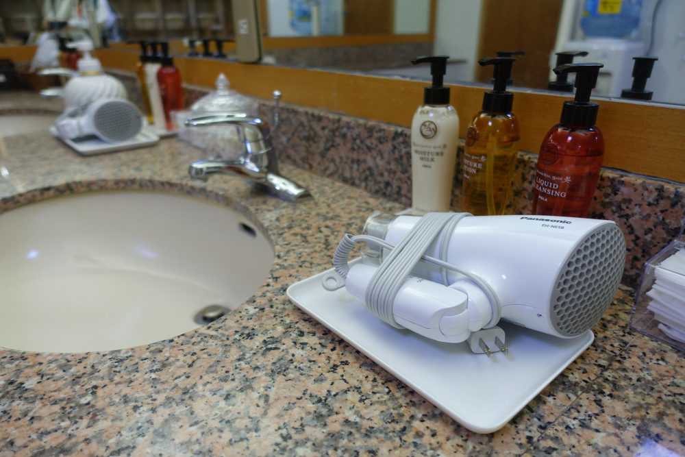 洗面台・脱衣所には、ドライヤーやコットン、クレンジング、化粧水などスキンケア用品も設置させているので、お部屋にあるタオルを持っていくだけでも大浴場を利用することができます♪