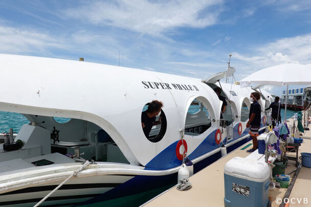 まずはグラスボートへ!展望塔の橋から見えるクジラの形をしたボートです。色違いのクジラが泳いでいるみたいでかわいいですよね!