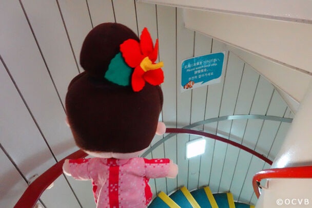 階段を下った先には、360度沢山の窓から海中の風景が広がっています!窓を覗くと、海中展望塔の周りを泳いでいるお魚やサンゴ礁を見ることができます☆