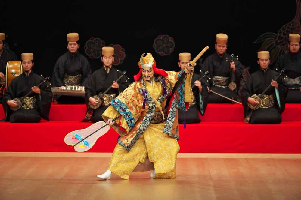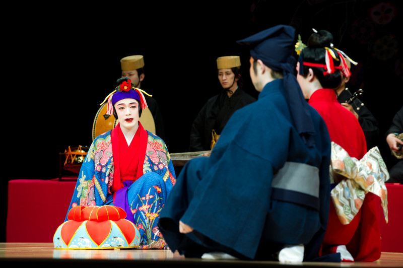 組踊(くみおどり)は、沖縄の伝統的な舞台芸術の一つで、音楽や踊り、セリフ(唱え)で構成される歌舞劇です。