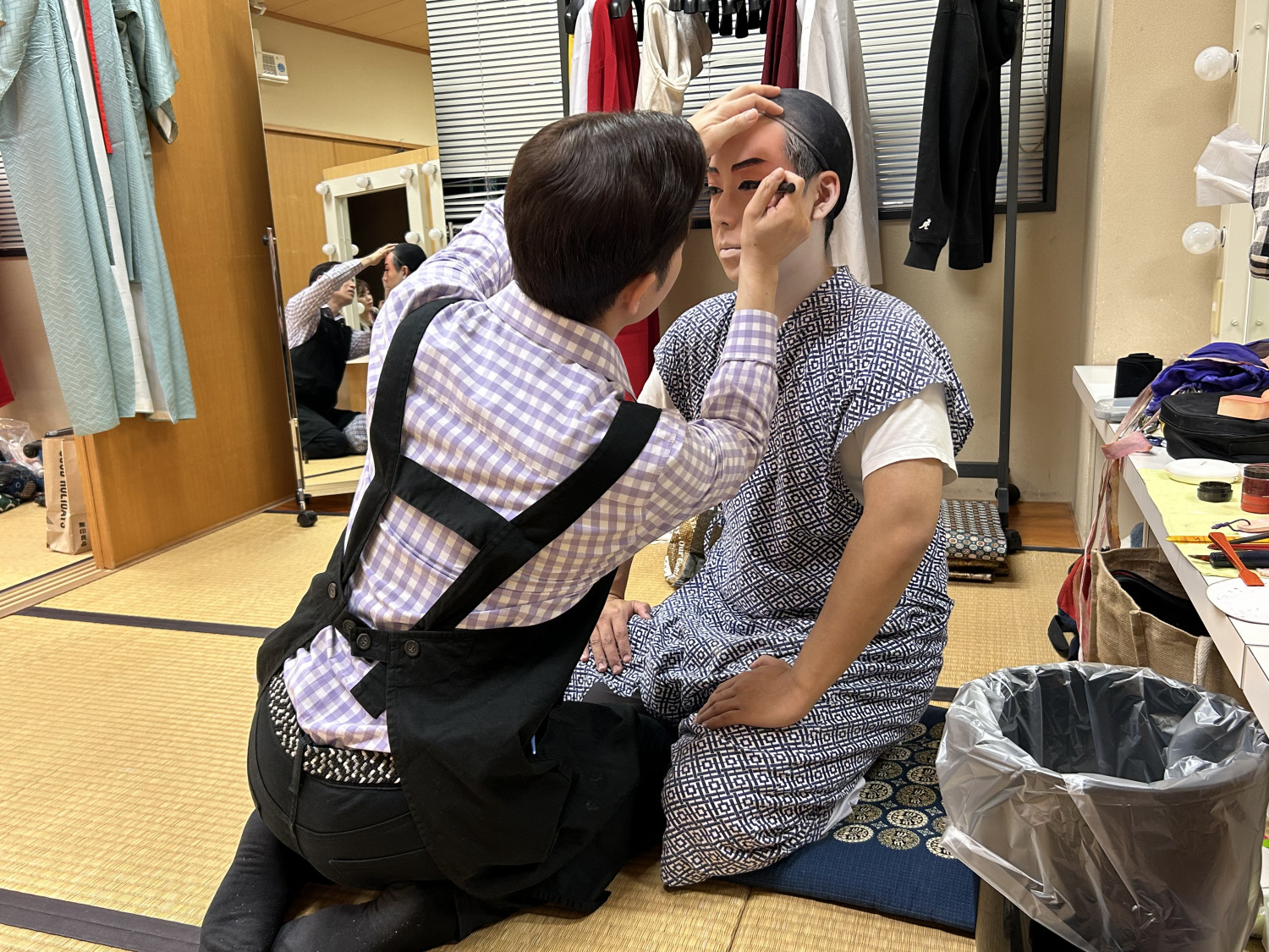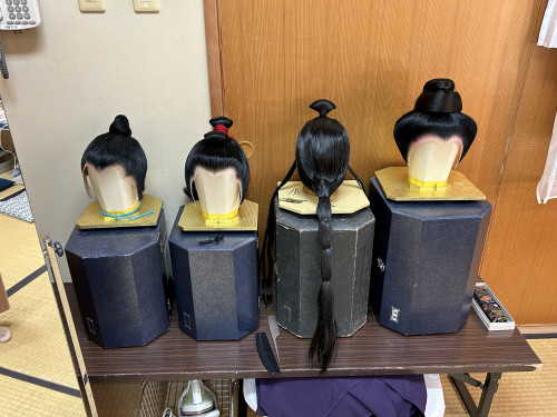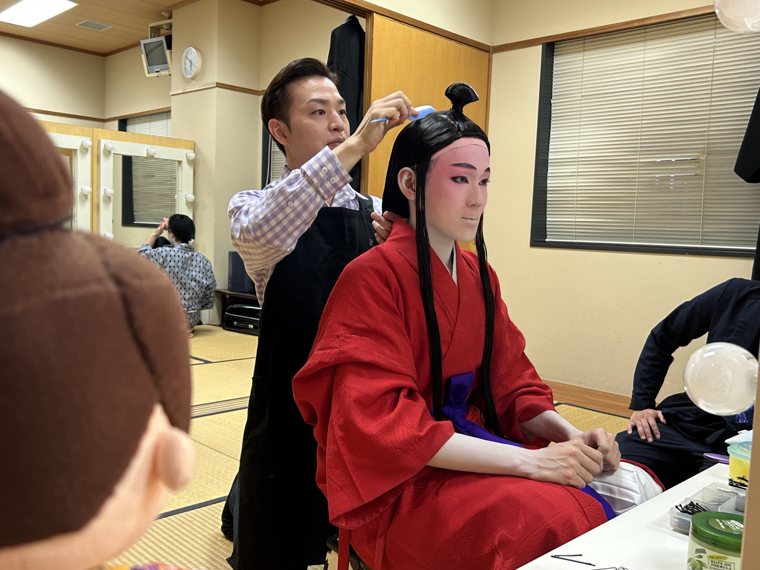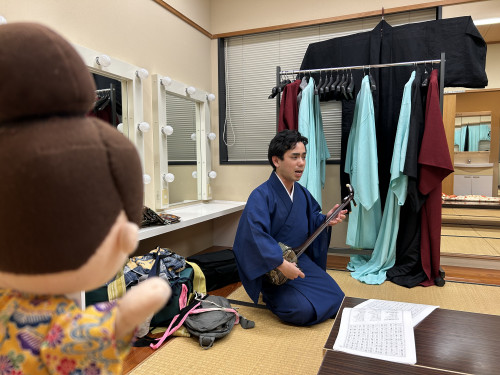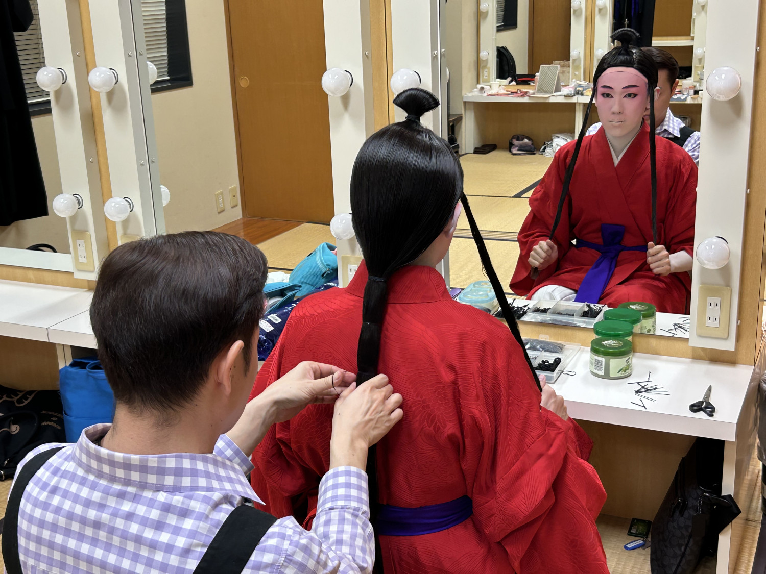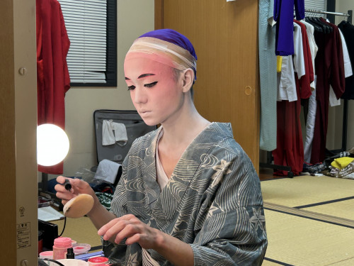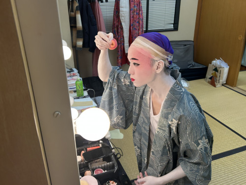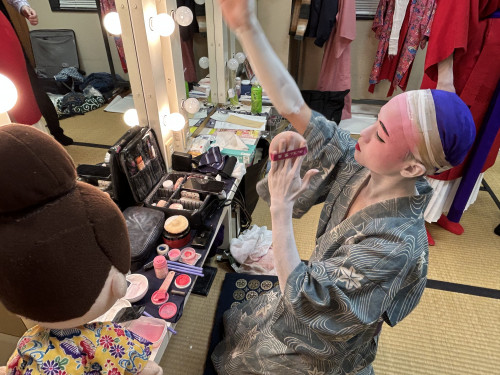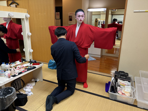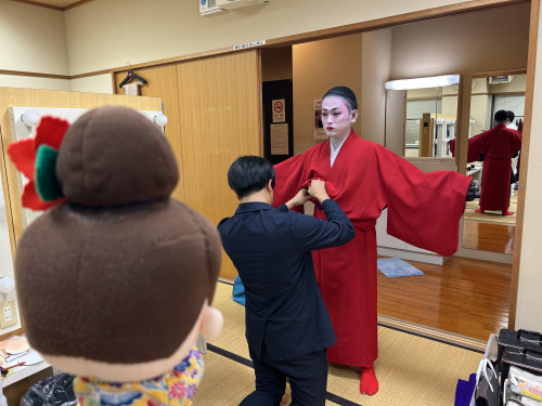 次に、立方(たちかた)の皆さんがいらっしゃる楽屋へ。本番前ということもあり、緊張感ただよう中、黙々と支度をされていました。皆さん、みるみるうちに姿がかわっていき、マハエも目が釘付けでした!