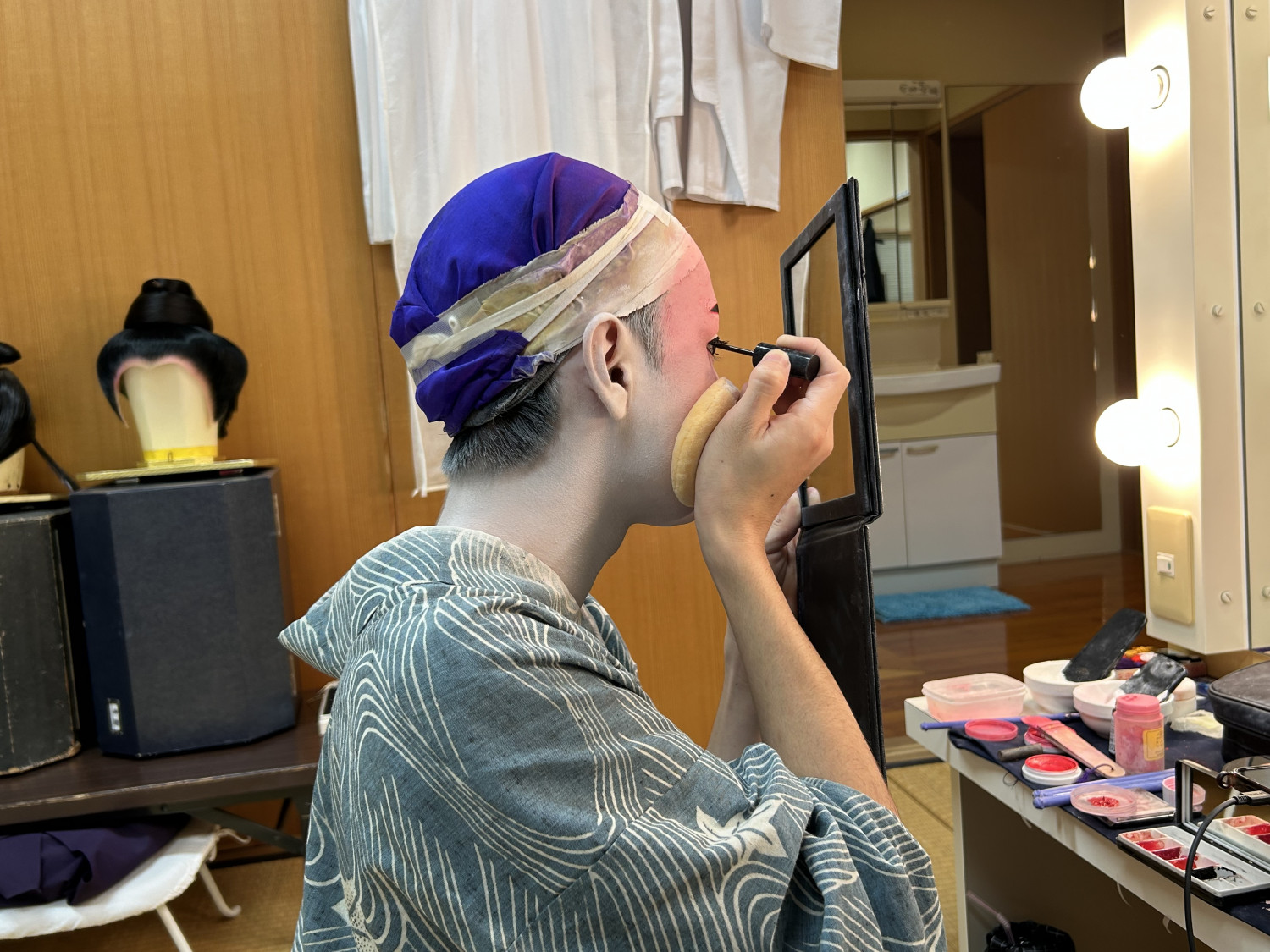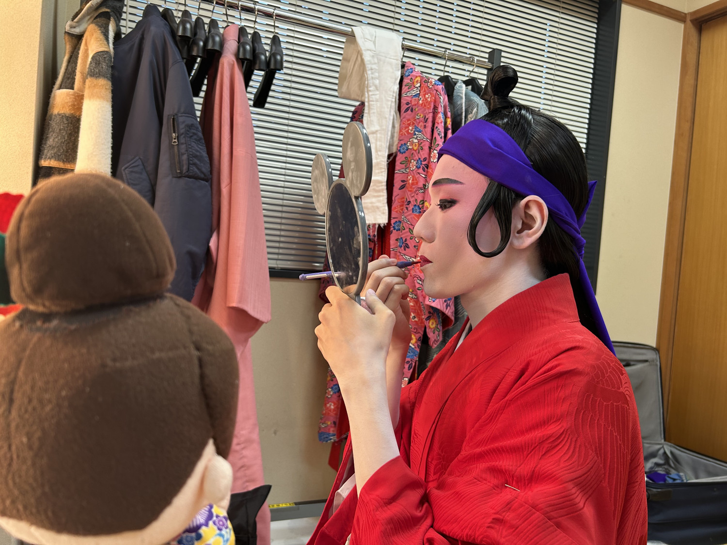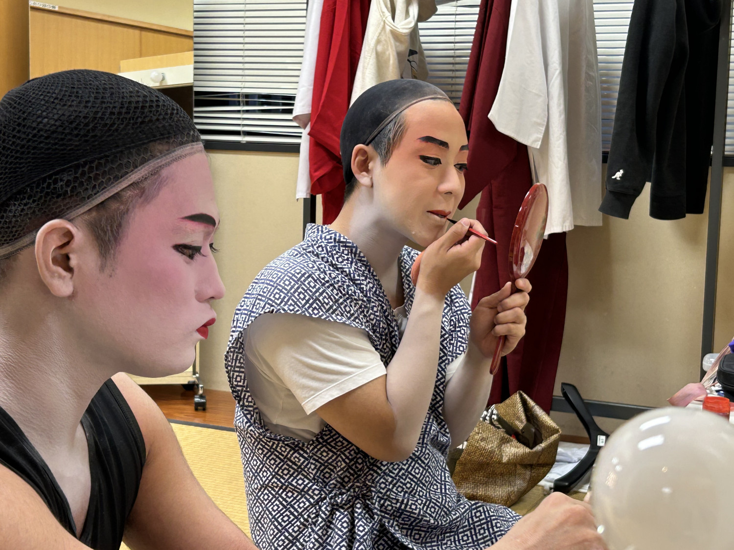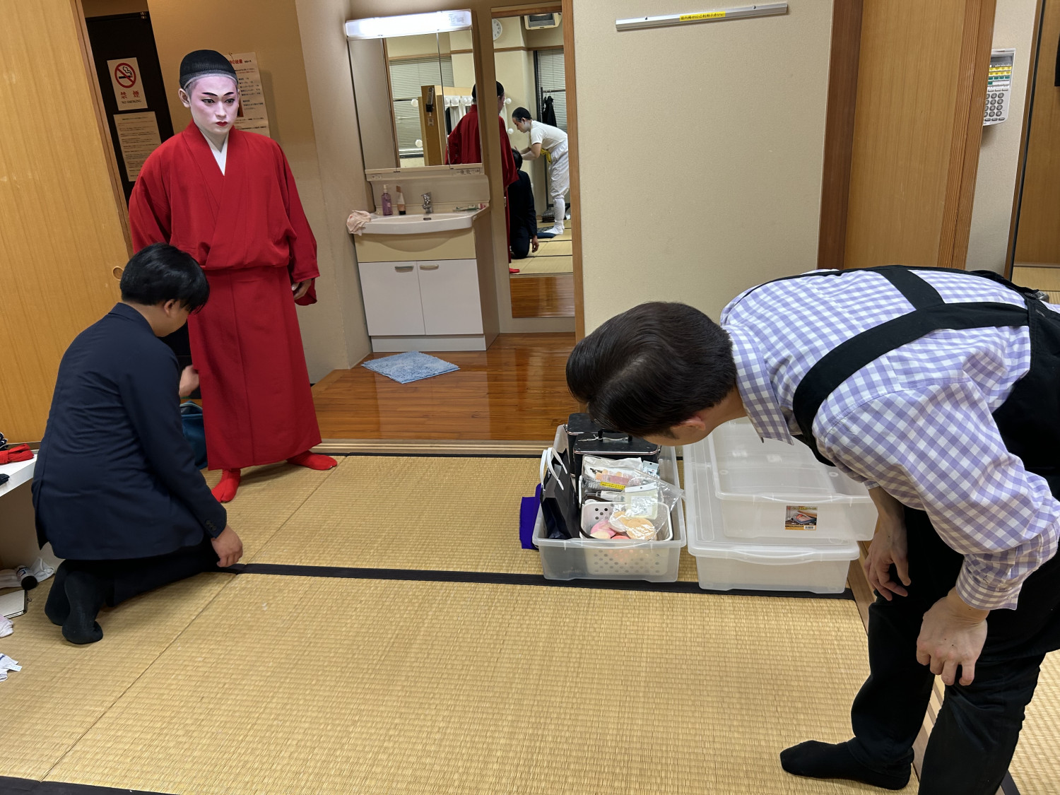 次に、立方(たちかた)の皆さんがいらっしゃる楽屋へ。本番前ということもあり、緊張感ただよう中、黙々と支度をされていました。皆さん、みるみるうちに姿がかわっていき、マハエも目が釘付けでした!