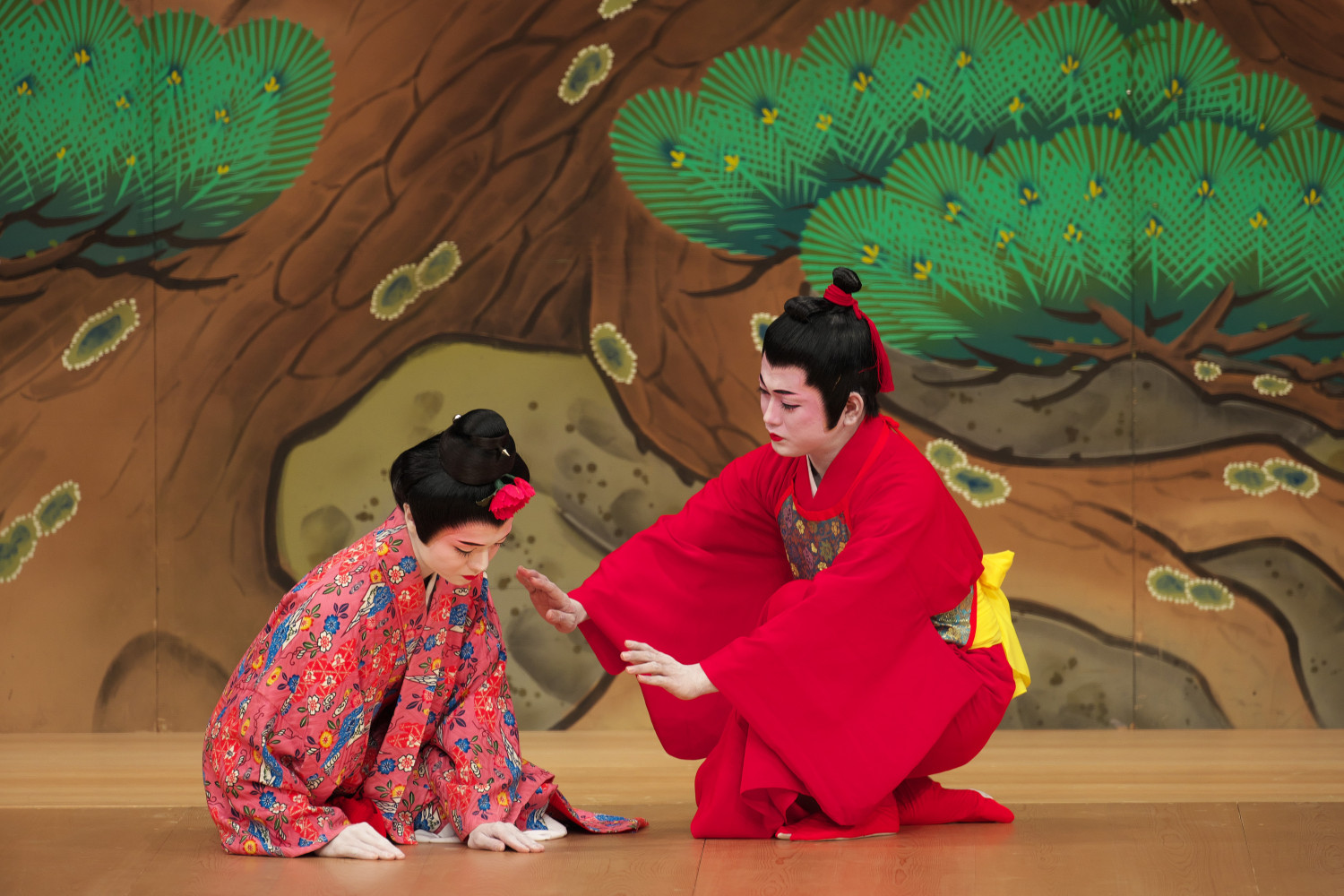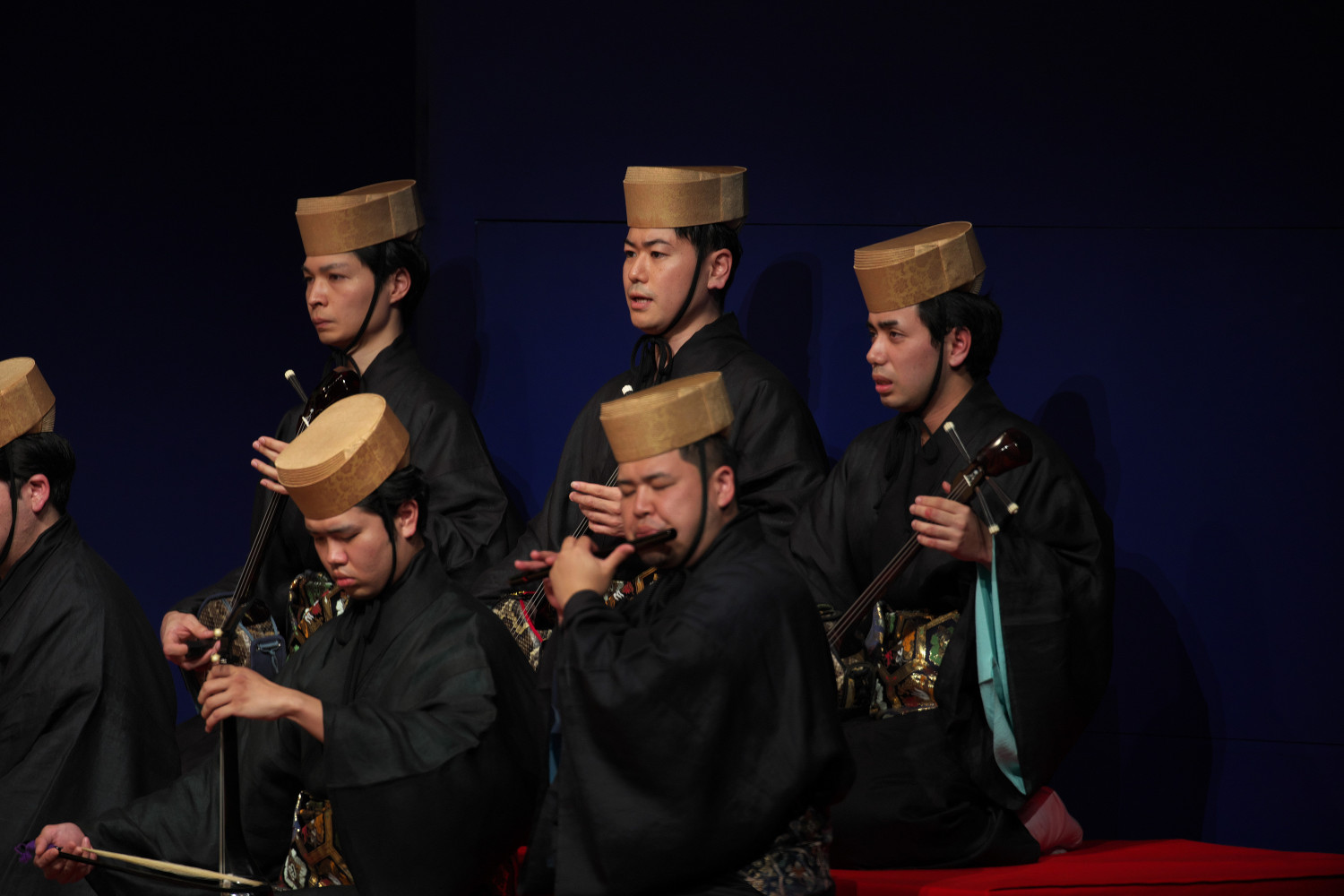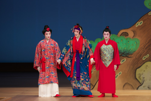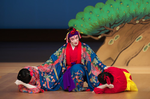 地方(じかた)の楽器の音色と歌が、観客を一気に組踊の世界にいざなってくれます。まるで琉球王朝時代にタイムスリップしたよう・・・ (*^^*) 琉球王国の王さまや、冊封使(中国からの使い)も当時、こんな光景を見ていたのですね~。とても優雅な気分になります。