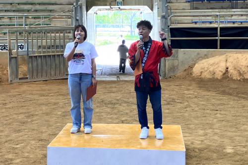 闘牛やうるま市について学べる「闘牛レクチャー」を実施します。解説は、地元で人気のMC・伊波大志さんとうるま市出身のタレント・よなみね のぞみさんが担当し、300インチの大型ビジョンを使って分かりやすく説明します。沖縄独自の闘牛文化やその魅力、歴史、さらには開催地であるうるま市の見どころについて、伊波さんのユーモアあふれるトークとともに理解を深めることができます。闘牛初心者にも親しみやすく、実際の観戦がより楽しくなる情報が満載です。