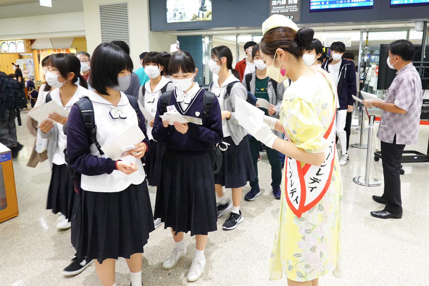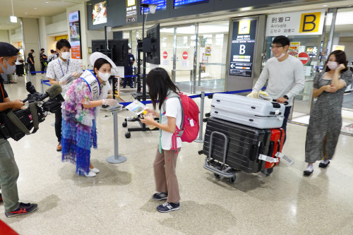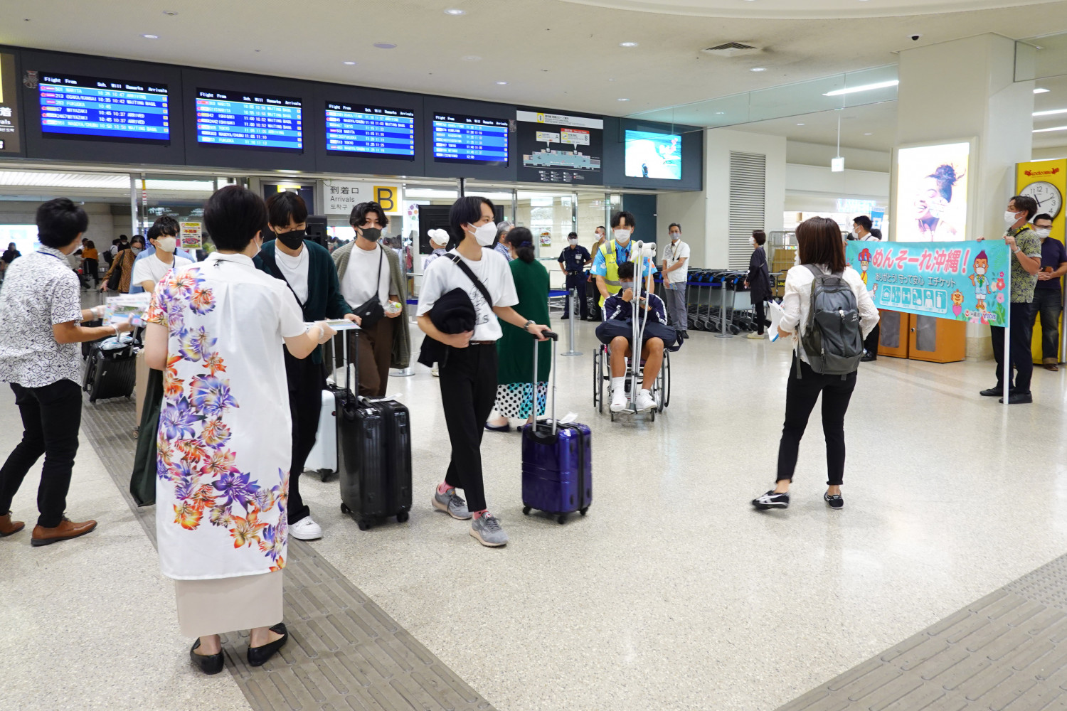 歓迎式では、沖縄観光親善大使ミス沖縄や那覇観光キャンペーンレディ、かりゆしウェアをまとった観光関係者などが訪れた観光客ひとりひとりに「ようこそ沖縄へ!!」の声掛けと共にポストカードやシールをプレゼント。感染対策をしながら沖縄で過ごす時間を安全・安心して楽しんで頂きたいという想いを込めた横断幕も準備され、空港内は歓迎ムードに包まれました。