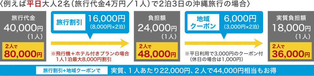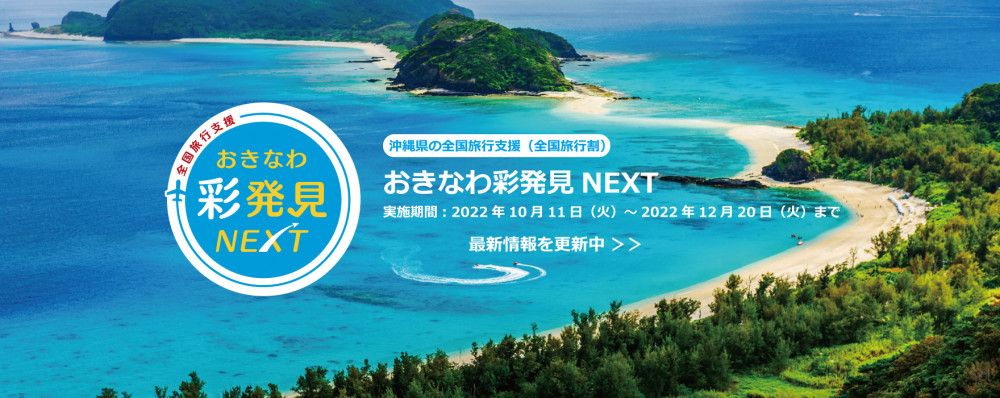 「おきなわ彩発見NEXT」とは、沖縄県での全国旅行支援(全国旅行割)の実施期間は2022年10月11日(火)~12月20日(火)まで。「おきなわ彩発見NEXT」を利用することで、目的地が沖縄県の旅行代金のうち40%割引(1人1泊あたり最大8,000円割引)+1人1泊あたり最大3,000円の地域クーポンが配布されます。「おきなわ彩発見NEXT」の概要や利用条件、よくある質問など最新情報は以下をご覧ください