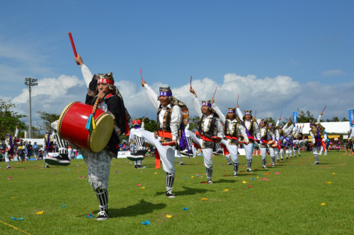 あまわりパーク歴史文化施設で土日祝日に見られる、現代版組踊「肝高の阿麻和利」のショートバージョンパフォーマンス