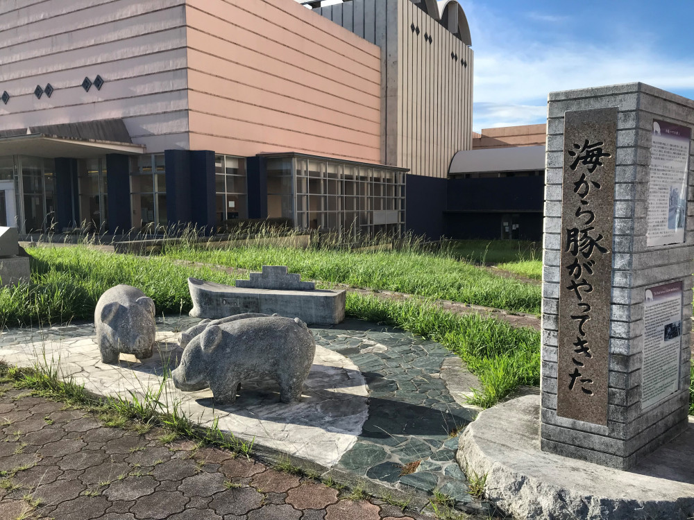うるま市民芸術劇場の敷地にある「海から豚がやってきた」の記念碑です。戦後間もないころ、食糧難で苦しむ沖縄に、ハワイに移民したうるま市出身の方々が中心になって、豚を送ってくれた話で、船は平敷屋のホワイトビーチに着き、沖縄に豚がひろがりました。昔はこれを演じる劇もあったと母から聞きました。機会があれば演じてみたいです。