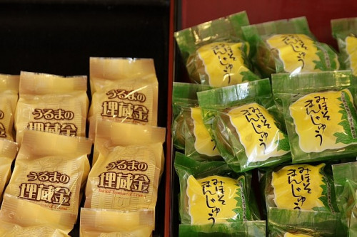 うるま市名産の黄金芋と、宮城島でつくられた「ぬちまーす」を使用した「うるまの埋蔵金」。うるま市の山城茶を使用した「みほそまんじゅう」。山芋のシフォンケーキもおススメです。