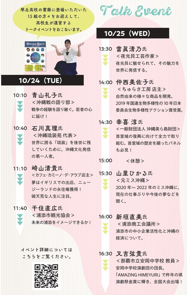 本の制作過程で先輩が出会った多くの⽣産者や表現者達を中⼼に、在校生達が声掛けした出店事業者とオンライン会議を重ね、フェアー開催に⾄りました。生徒たちの、沖縄への修学旅⾏期間中の10⽉24⽇(午前)、25⽇(午後)は、琴丘高校の書籍に登場いただいた15組の方々をお迎えして高校生が運営するトークイベントを行います。