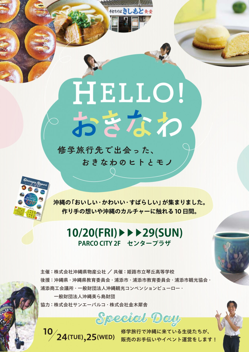 10⽉20⽇(⾦)〜29⽇(⽇)、サンエー浦添⻄海岸PARCO CITYにおいて「HELLO!おきなわ 〜修学旅⾏先で出会ったおきなわのヒトとモノ〜」と題した、物販、ワークショップ、トーク・ライブイベントなど、作り⼿の想いや沖縄のカルチャーに触れる10⽇間のイベントが開催中です!サンエー浦添⻄海岸PARCO CITYに行かれた際には是非お立ち寄りください。