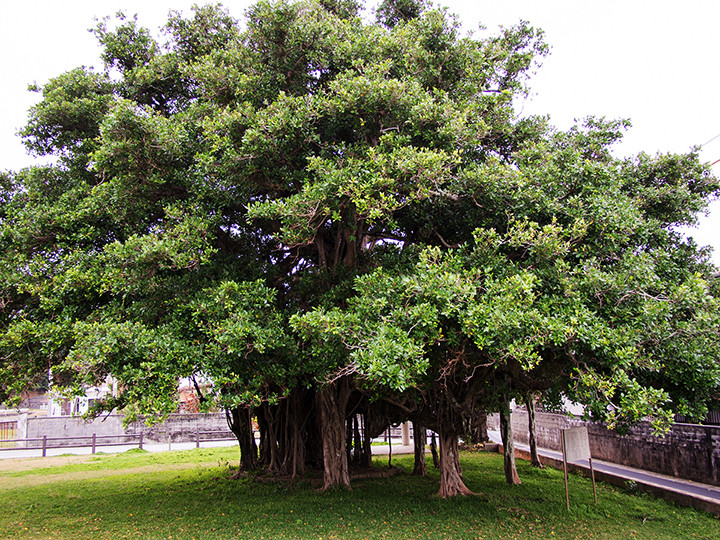 伊芸区集落のほぼ中央に位置する旧伊芸区事務所跡地に立つ、幹周3.9m、樹高11メートル、推定樹齢約300年を誇るガジュマルの巨木。地域の人々からは「フンシー(風水)ガジュマル」と呼ばれており、多くの気根を伸ばすその威風堂々とした姿は伊芸区のシンボルとして昔から親しまれてきました。