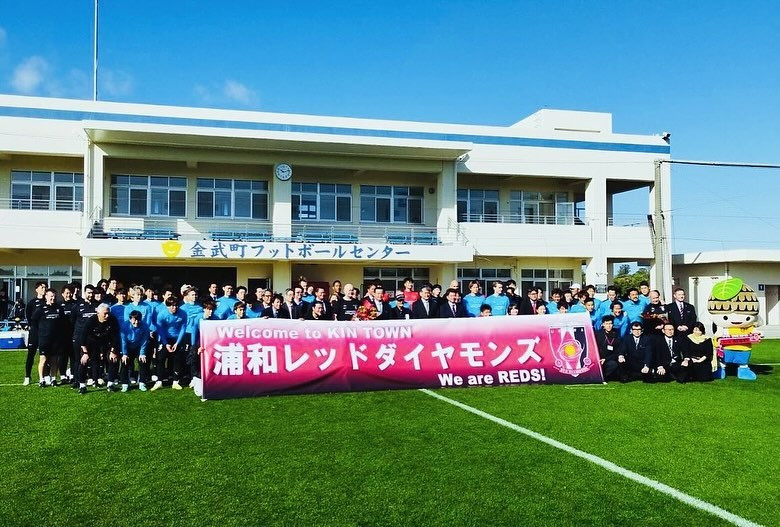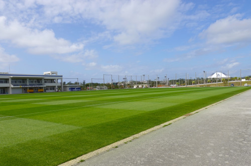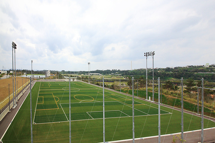 金武町フットボールセンターは平成28年2月に完成。JFA(日本サッカー協会)公認の人工芝のピッチと天然芝のピッチをそれぞれ一面ずつ備えています。夜間照明はもちろん、医務室や会議室を備えたクラブハウスも完備。プロチームのキャンプやオリンピックチームの合宿にも使用できる本格的な施設です。駐車場も天然芝グラウンドに79台、人工芝グラウンドに64台と広々。