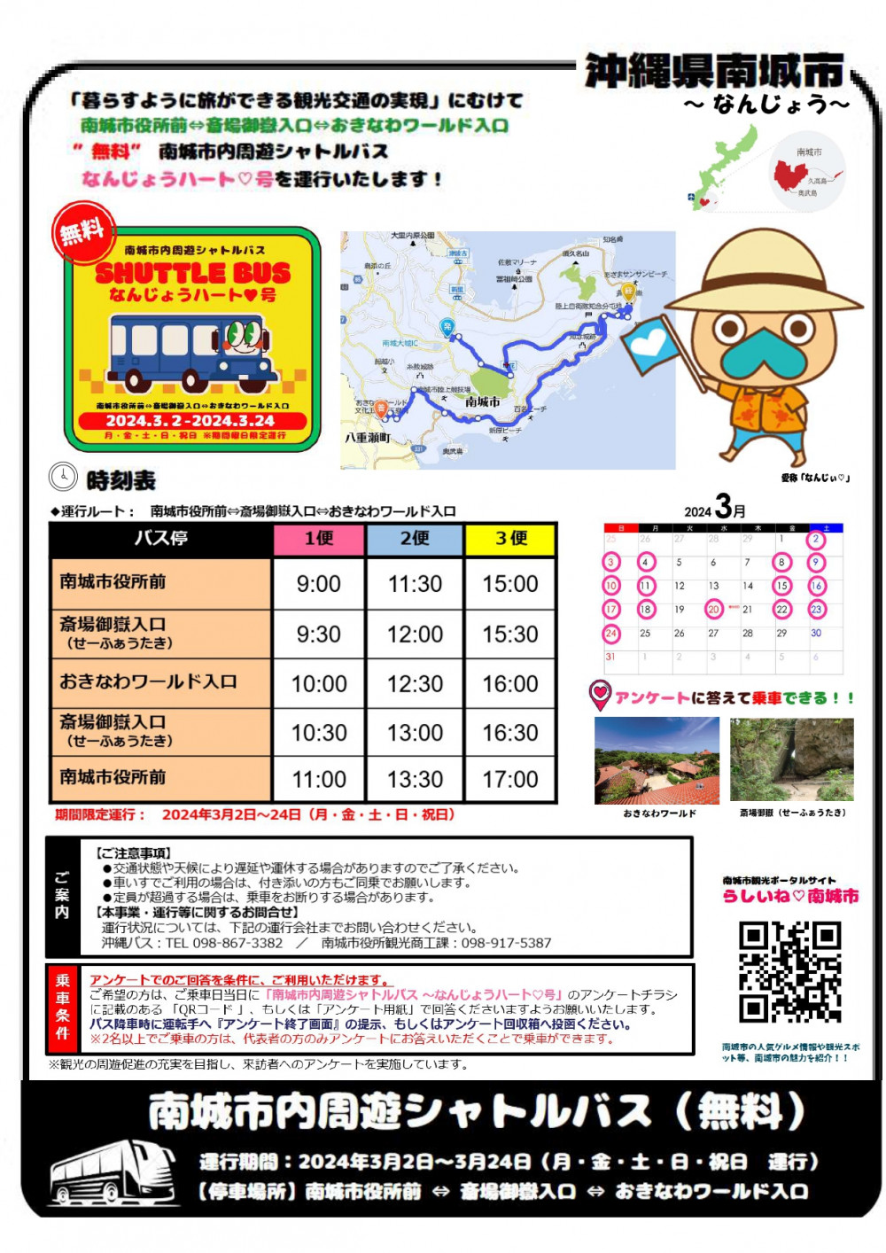 「暮らすように旅ができる観光交通の実現」に向けて“無料”南城市内周遊シャトルバス なんじょうハート号 が2024年3月2日〜3月24日(月・金・土・日・祝日のみ)にかけて運行されます。是非ご利用ください!